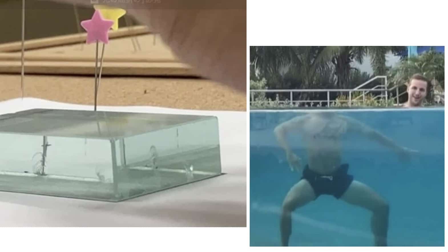 頭と首が分かれた!プールで体が分かれる驚きのトリック写真!(光の屈折)