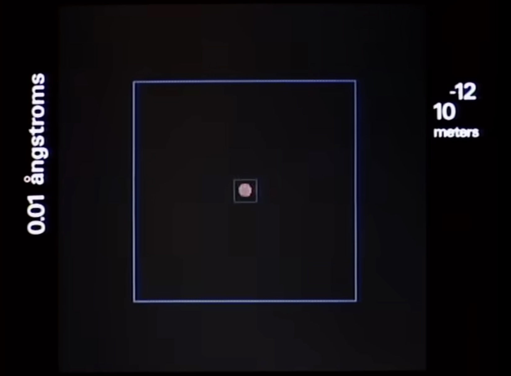 —and then plunge back to Earth, through a person’s skin, into cells, atoms, and finally all the way down to the subatomic world at 10 to the minus 12th power meters in one non-stop trip.