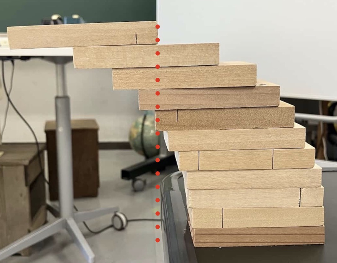 一番上の本は、一番下の本よりも完全に外側にはみ出しています。そして、ここからが科学の本当に面白いところ。この数列 1/2 + 1/4 + 1/6 + … は、数学の世界で「調和級数」の仲間として知られており、この足し算は無限に大きくなることが証明されています。つまり、理論上は、無限に本を積み重ねれば、どこまでも遠くへはみ出させることができるのです!