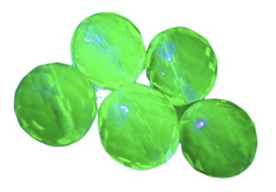 先日、京都にある「ウサギノネドコ」という、鉱物を美しく展示・販売されている素敵なお店に伺いました。そこで出会ったのが、このウランガラスです。一見すると淡い黄色のガラス玉のようですが、ここに紫外線をあててみると……驚いたことに、ガラス自体が意志を持っているかのように、パッと鮮やかな緑色に発光したのです。