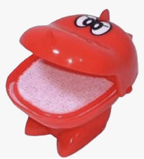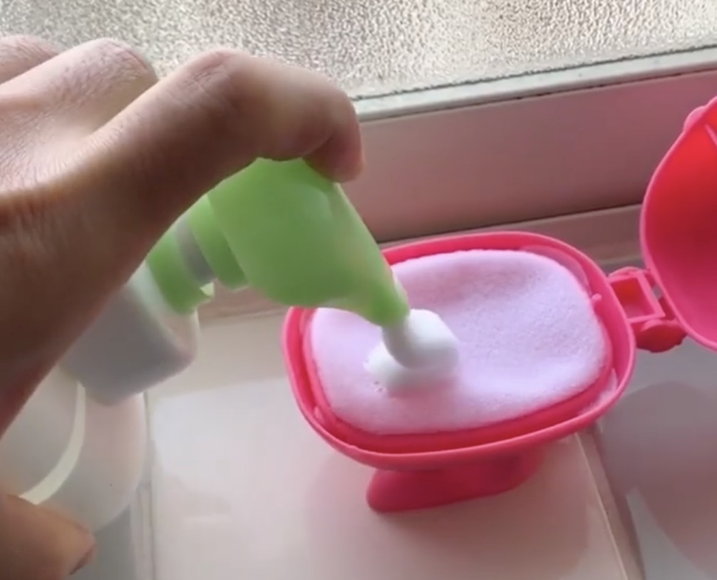この「あわドン」、使い方はとってもシンプルです。口の中にタオル地のような布が張られていて、そこに石鹸水(シャボン液)を塗ります。