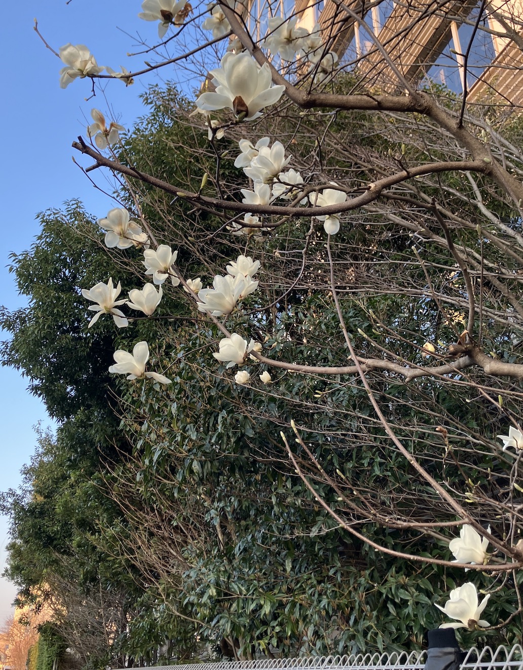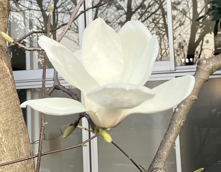 子供を連れて公園に行ったところ、ハクモクレンの花が美しく咲いていました。モクレンの仲間だそうです。見頃は本当に一瞬で、あっという間に散ってしまうため、満開の姿に出会えるのはとても貴重なことですね。