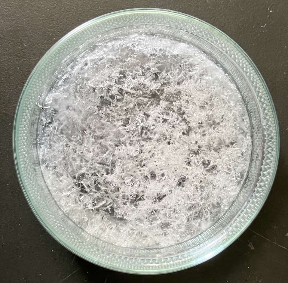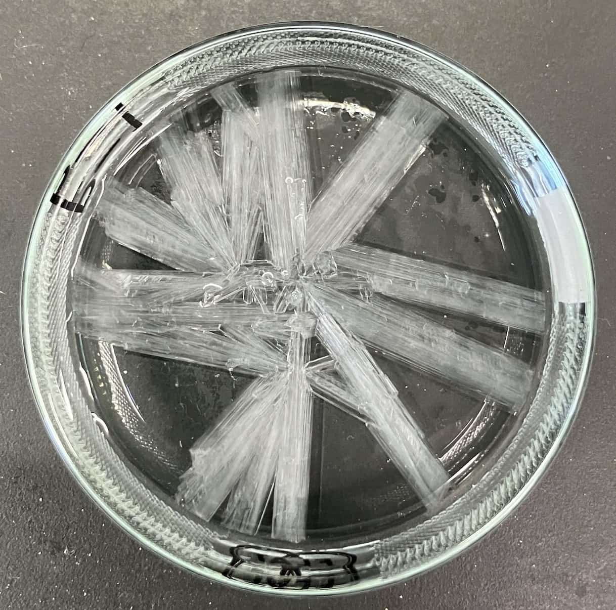 次の時間になったら、もう一度同じ作業をして、今度は氷水につけて一気に冷やします。シャーレ自体を氷を入れたパットの中に入れてよく冷やしてから注ぐとうまくいくと生徒が教えてくれました。コツです。ある程度冷えたところで、結晶核となるようにぱらっとまたハイポの粒を落とします。すると次のような結晶ができます。