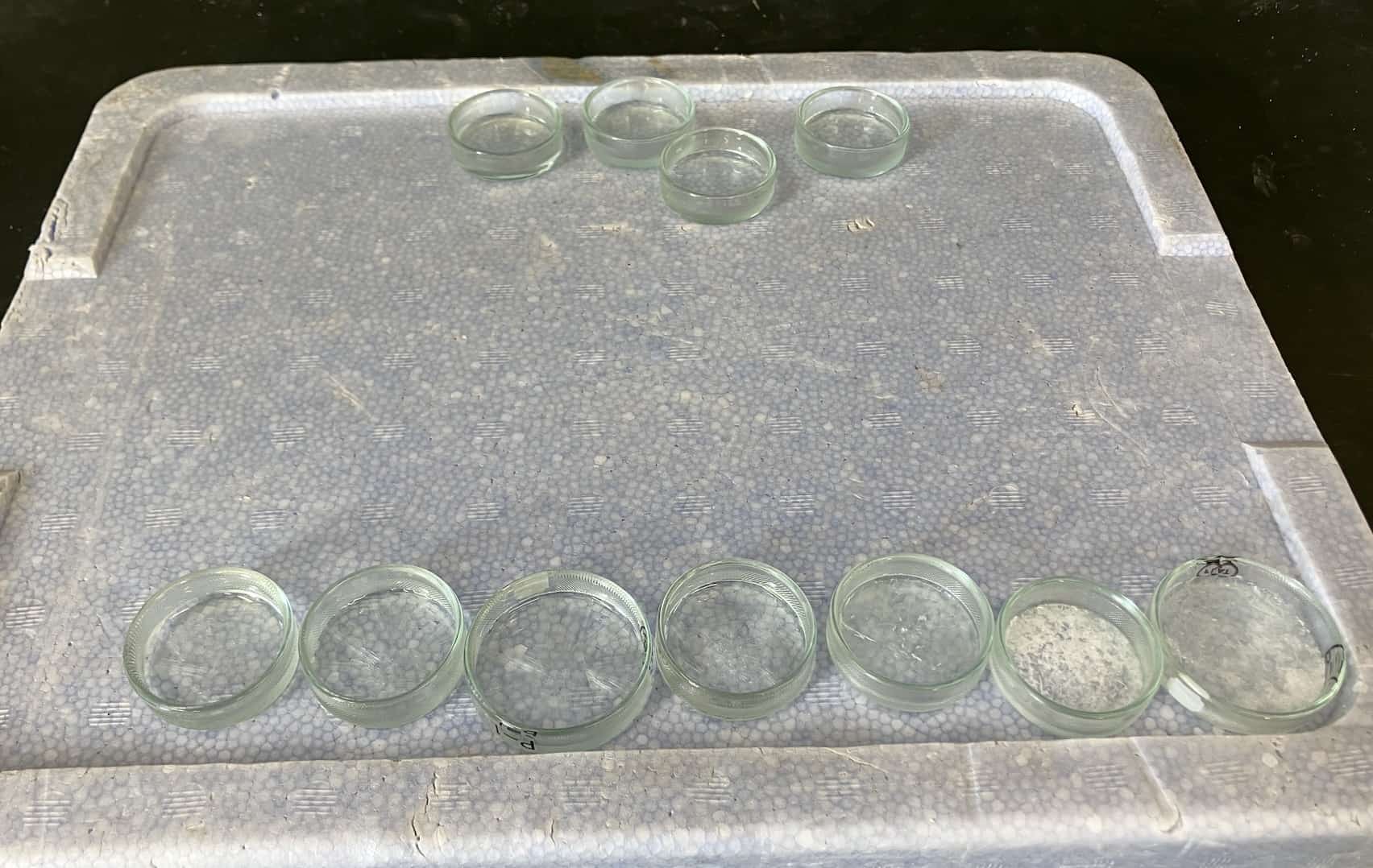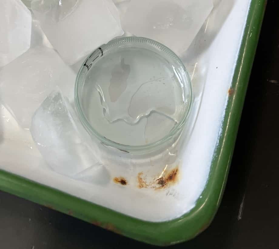 液体になったら、小さなシャーレの上に注ぎ込みます。ここでも注意点。シャーレはゴミのついていない綺麗なものを使います。結晶がここからできてしまうことを防ぐためです。注いだらゆっくりと発泡スチロールの上に乗せて、ゆっくりと冷まします。結晶ができるまでに時間がかなりかかるので、この状態で1時間目を終えるといいと思います。