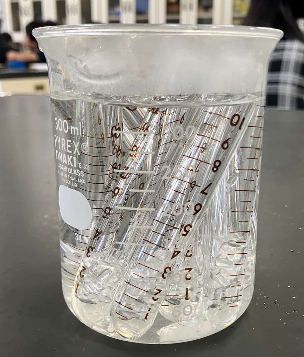 試験管にハイポを入れて、湯煎で溶かします。温度は60度くらいが良いです。理科室の給湯器がおよそ70度くらいなのでちょうど良いです。この時試験管は綺麗な試験管を使いましょう。使い回しだと良い実験ができないので注意が必要です。