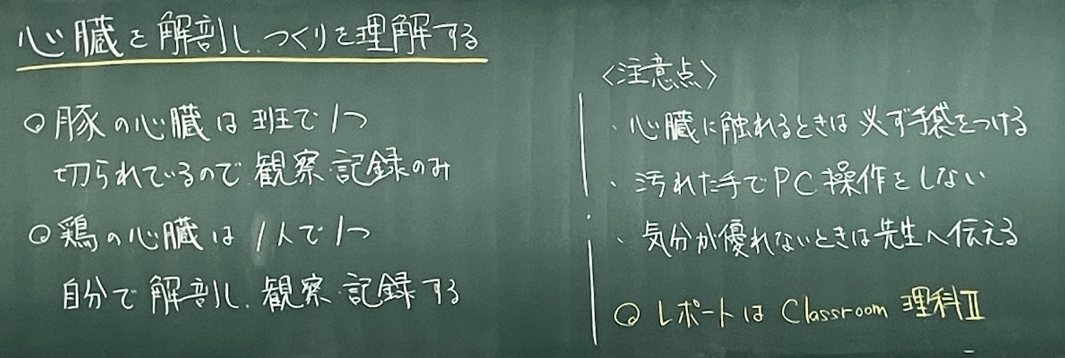 実際の心臓を見るので、苦手な生徒もいるだろうとおもい、事前に予告や復習をしておくことの指示を出しておきました。こちらは1週間前に出しておいたものです。