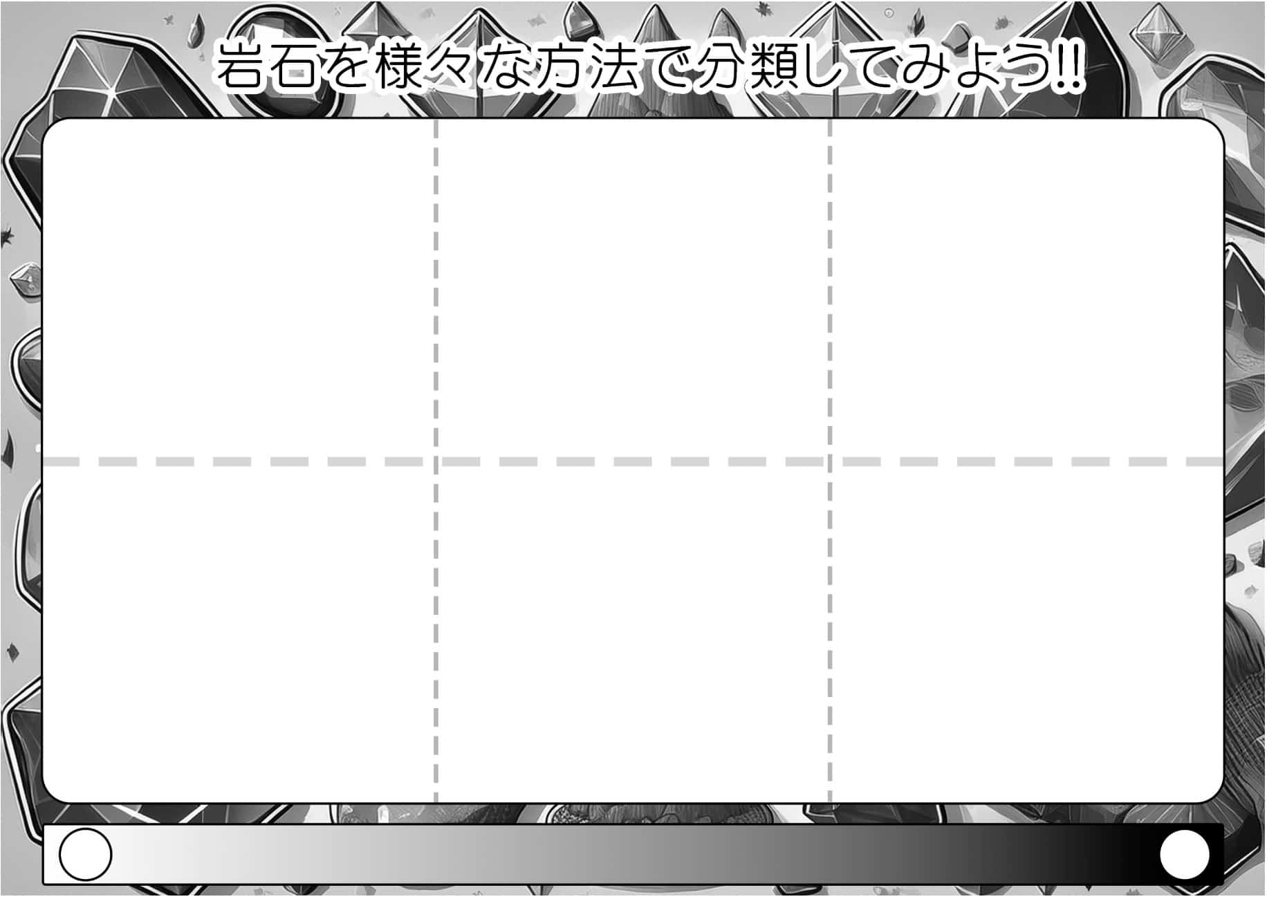 - A3サイズのワークシート(分類チャート用)→ 広めのマス目に「色」「結晶の大きさ」などのキーワードを書いておきます。