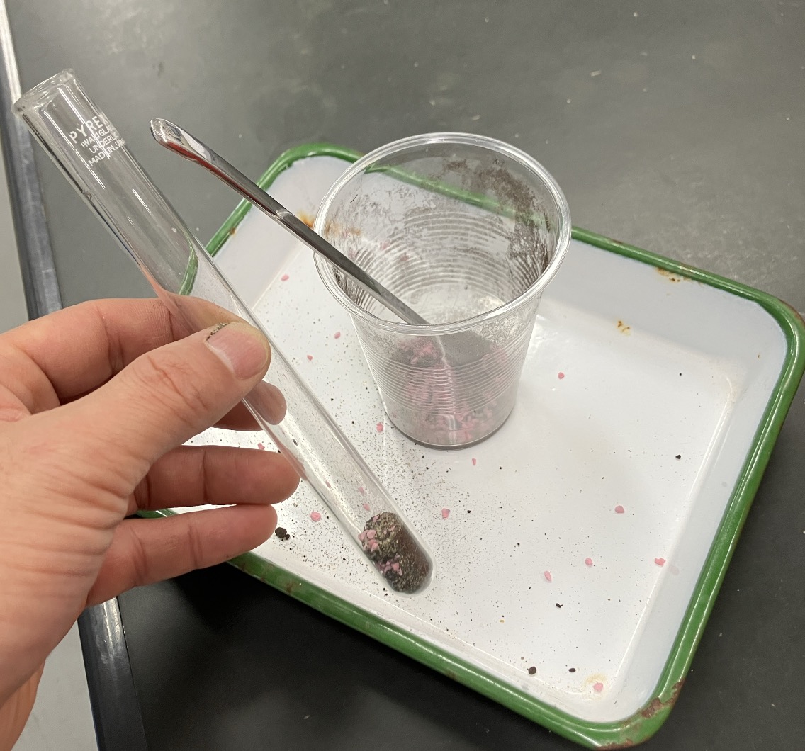 ② ①で混ぜたものを、薬さじで試験管の中に3杯入れます。