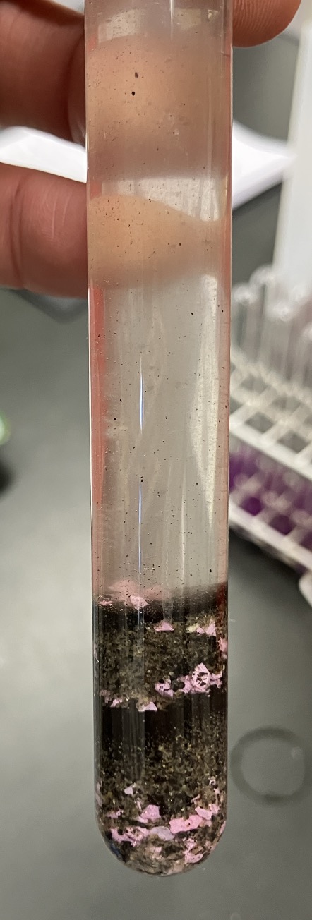 あっという間に、下から「れき(ゼオライト)」「砂」「泥(土)」の順番で層ができましたね!これは、大雨で川が氾濫し、運ばれてきた土砂が静かな水中で積もるときの様子を再現しています。ポイントは「粒の大きさと重さ」。水の中では、大きくて重い粒ほど速く沈み、小さくて軽い粒ほどゆっくりと漂いながら後から沈みます。自然界で起きている現象を、目の前で観察できる瞬間です。