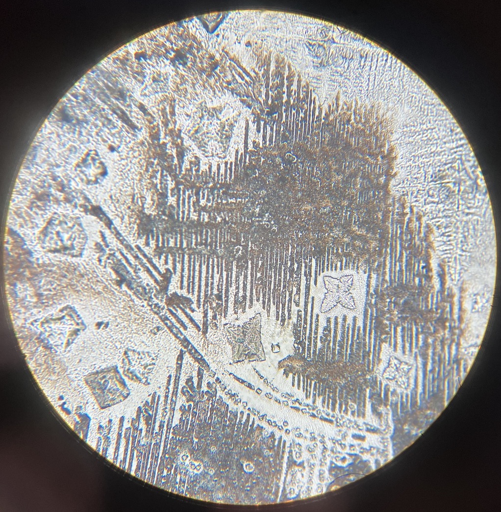 中和が無事に終わったら、仕上げの作業です。 スライドガラスにその溶液を1滴垂らし、そのまま水を蒸発させます。すると、どうでしょう……。 次回の授業で顕微鏡をのぞくと、そこには四角い、透明な美しい結晶が現れているはずです!
