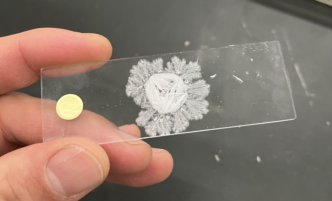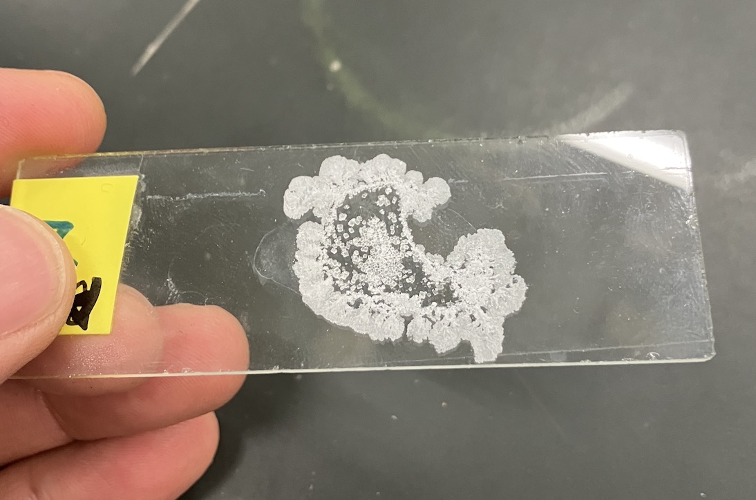そこでスライドガラスに食塩水を垂らして、自然乾燥させて、結晶を観察します。時間がない場合は事前に各班2枚のプレパラートを用意しておくといいと思います。