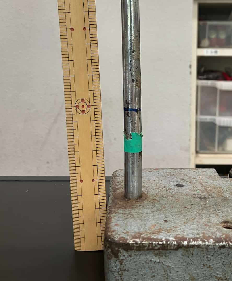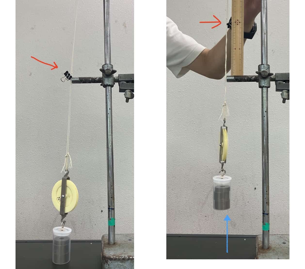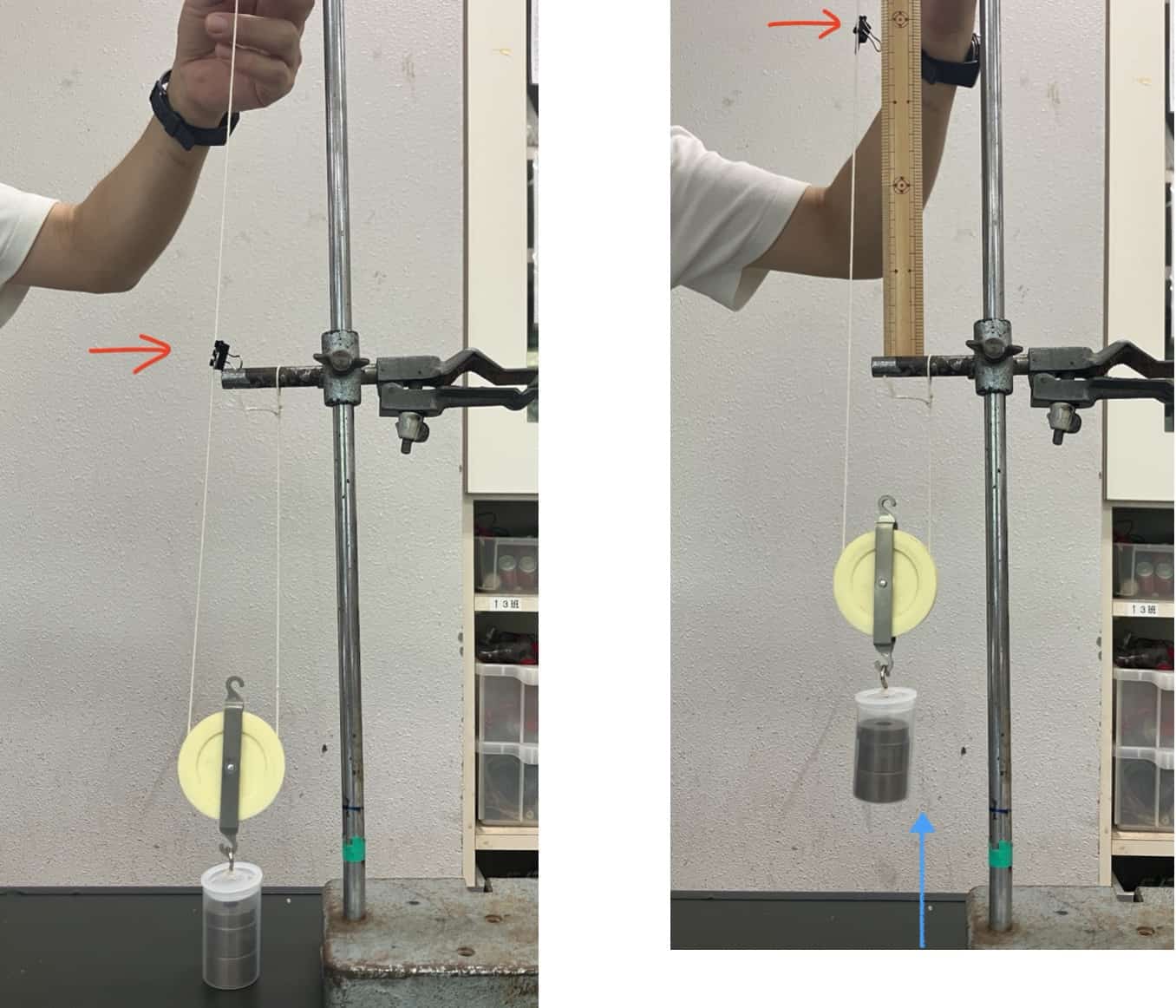 このとき、糸にクリップをつけて、糸をどれだけの高さたぐりよせたのかをはかります。