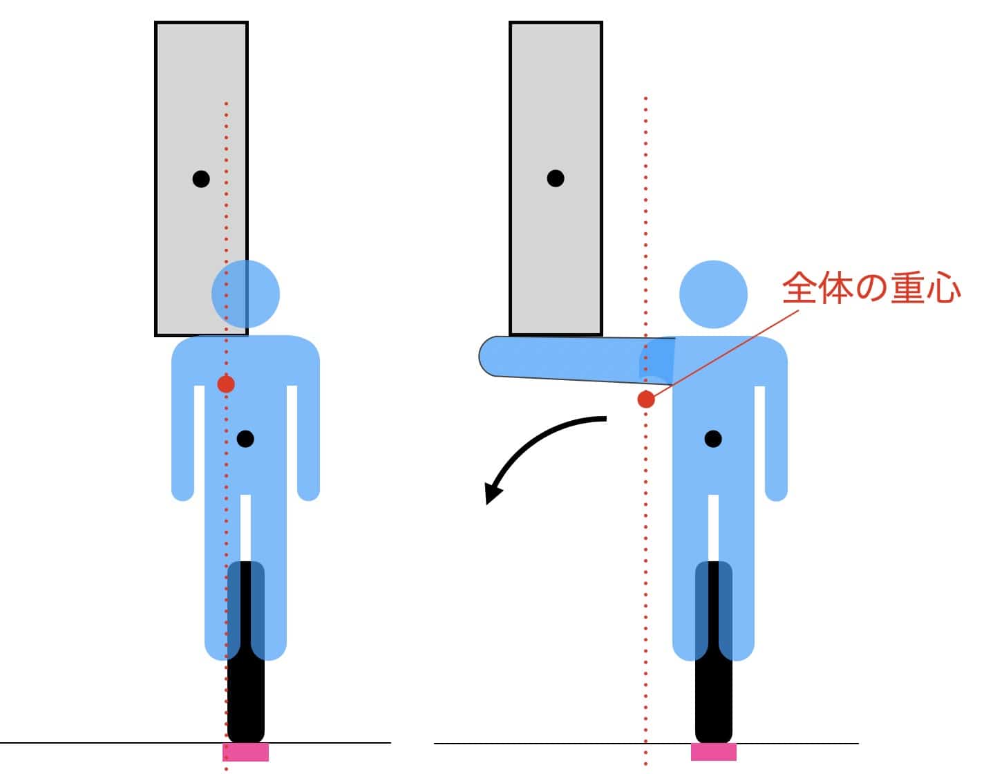 最後のコツは、タワーを体に密着させて固定することです。重い荷物を持つとき、体から離して持つより、体に引き寄せた方が楽に持てますよね?これは**「てこの原理」**で、支点(体)と力点(腕)の距離が近くなり、必要な力が小さくて済むからです。