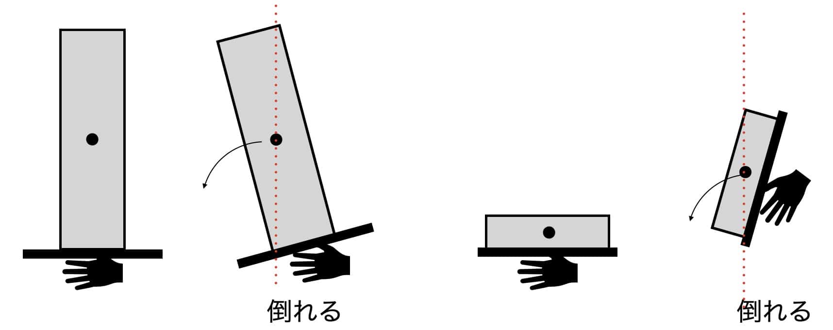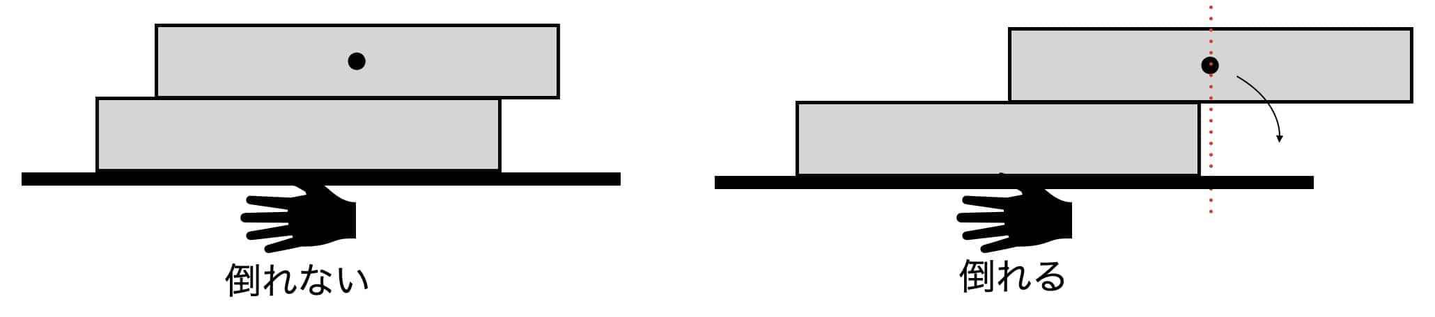 その秘密は、**「支持基底面(しじきていめん)」**という考え方にあります。これは、物体を支えている底面の面積のこと。ジェンガを想像してみてください。下のブロックの真上に積んでいるうちは安定していますが、少しずつずらしていくと、ある瞬間にガシャン!と崩れますよね。