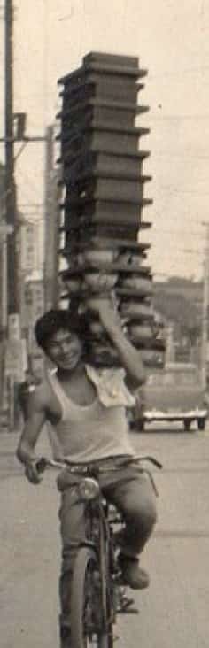皆さん、マンガやテレビで、自転車に山と積まれたお蕎麦のセイロを、まるで体の一部のように操って運ぶ出前の職人さんを見たことはありませんか?こちら昭和の写真ですが、そばの出前の様子です。