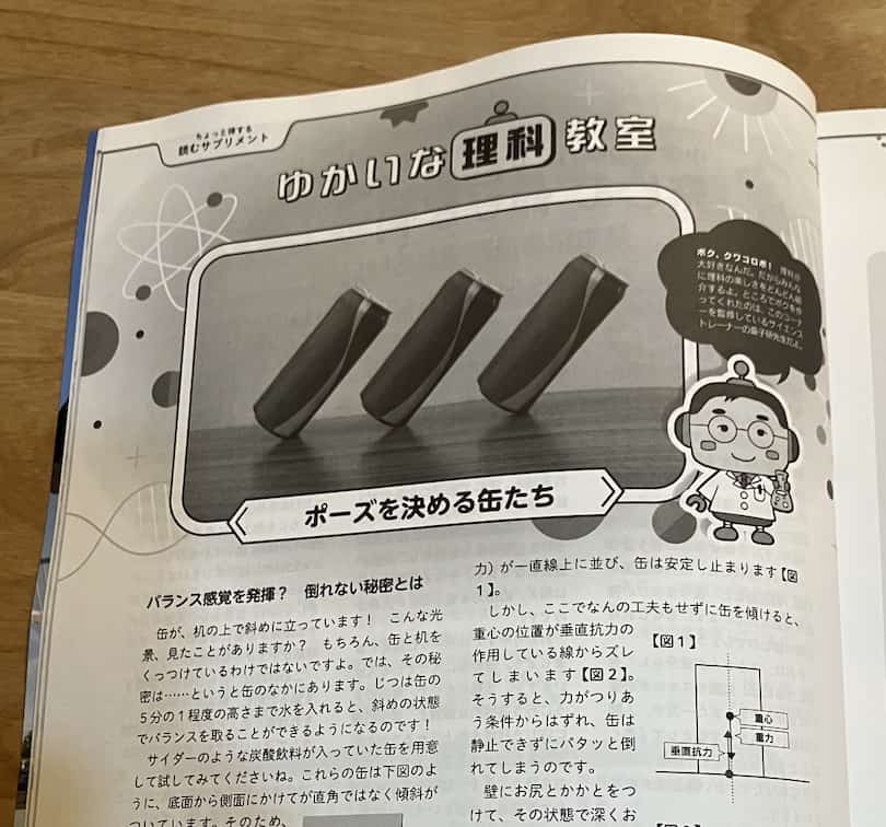 ぜひ雑誌を手に取って、缶が斜めに立つ不思議な実験の仕組みを味わってみてください。