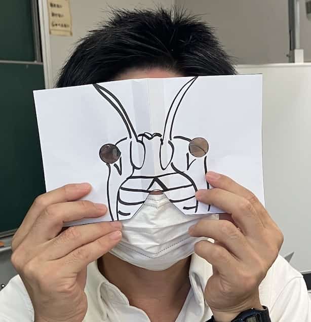お面にはいろいろな絵柄を描いてみましたが、バッタの絵柄がマスクと合わさってとても面白くなりました。
