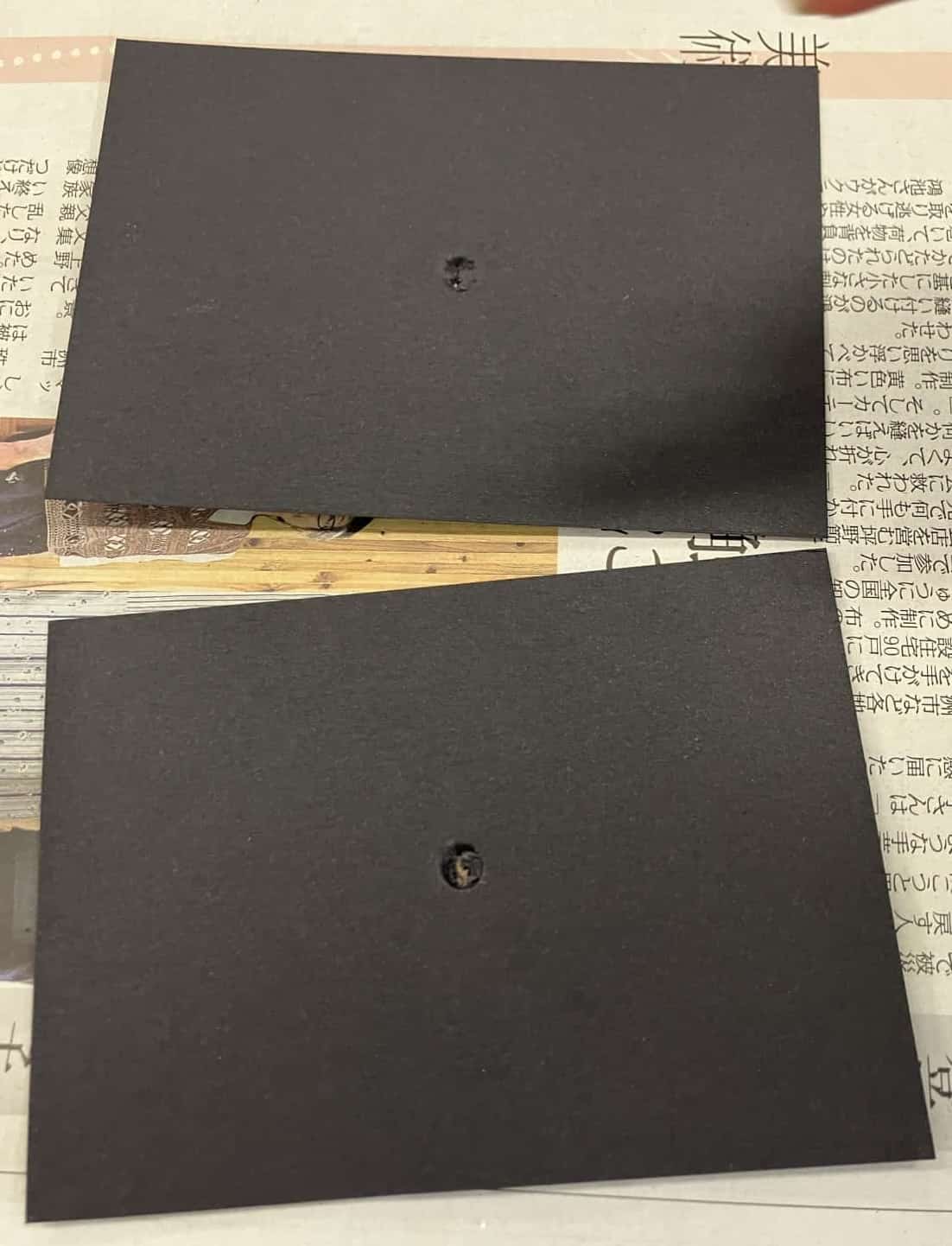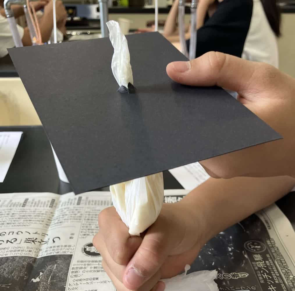 作ったマグマをビニール袋に入れ、できるだけ空気を抜いて口を縛ります。これがマグマだまりです。次に、黒いボール紙の真ん中に小さな穴を開け、その下にビニール袋の先端が少しだけ出るようにセットします。