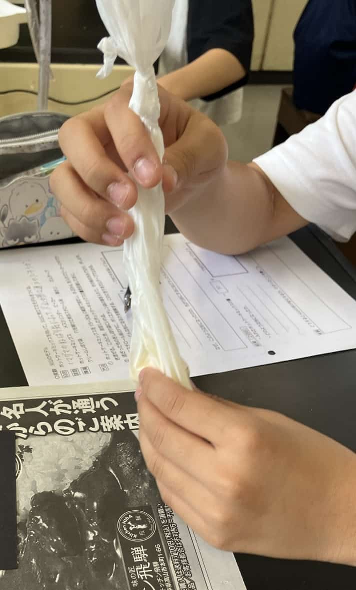 いよいよ噴火です! ビニール袋の先端をハサミで少しだけ切り、袋をゆっくりと押し出してください。流れ出たマグマは、どんな形の山を作りましたか? おそらく、なだらかで、横に広がった形の火山ができたはずです。