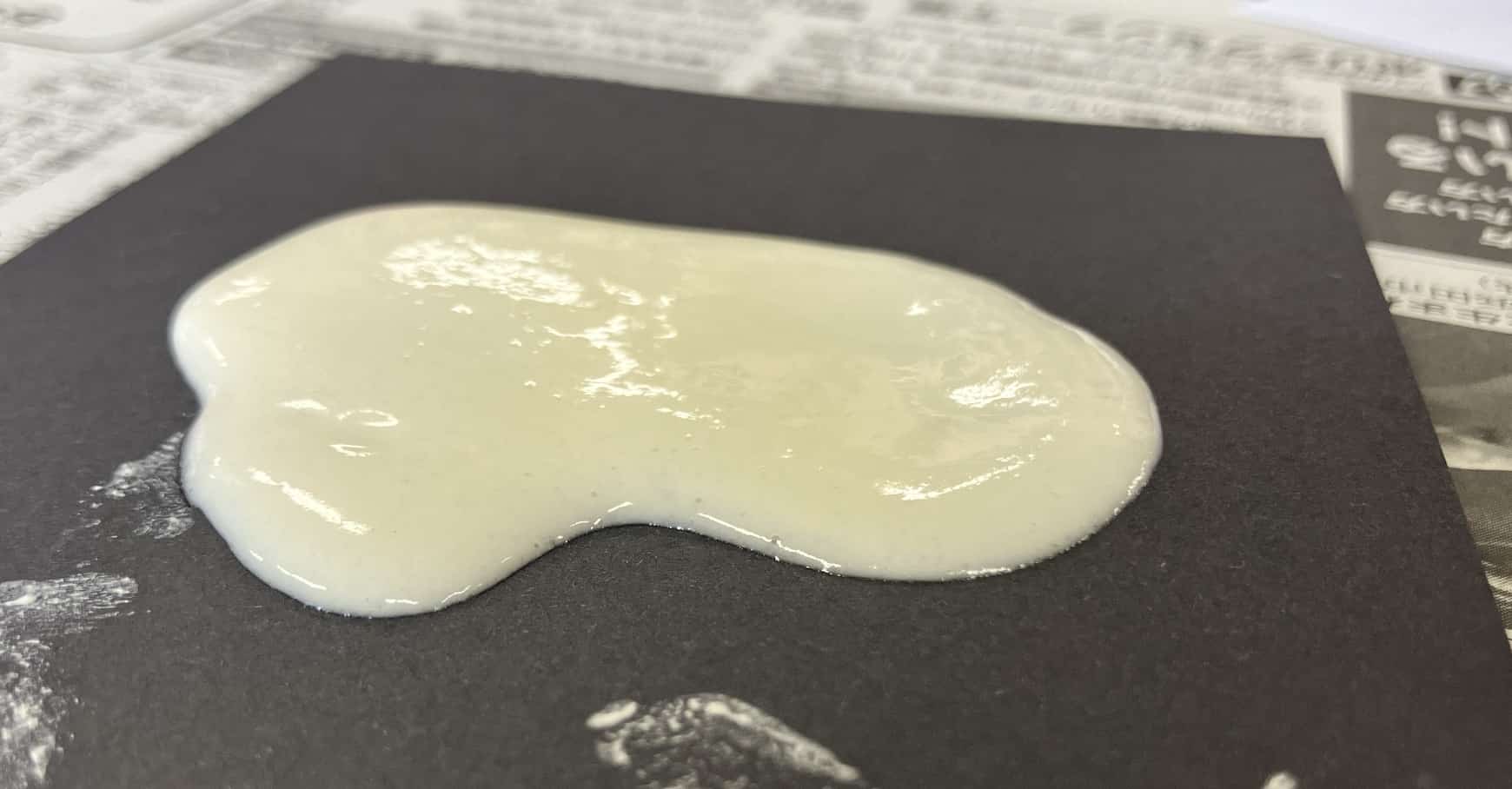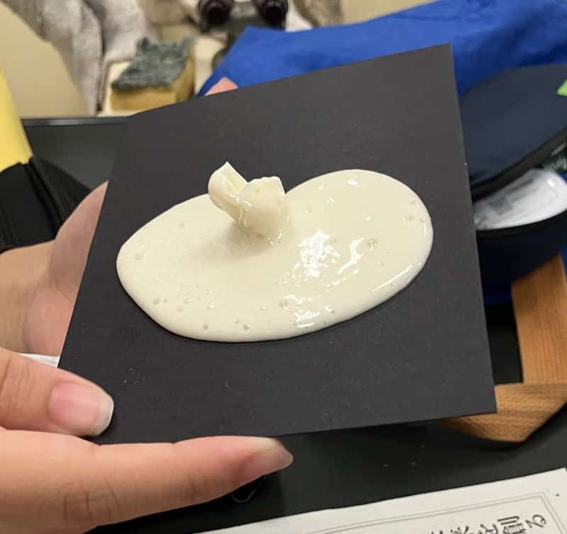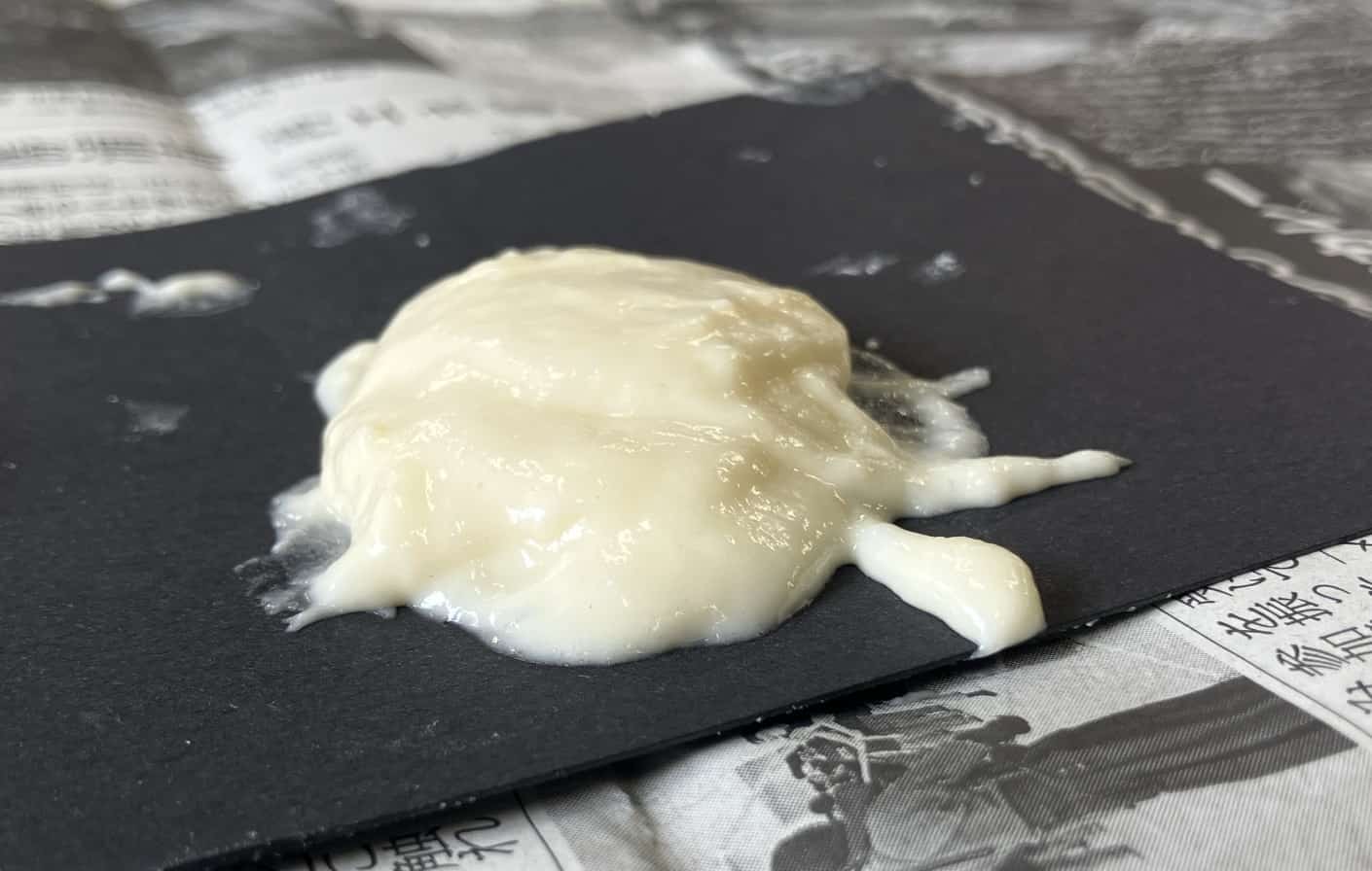 一度実験が終わったら、今度はマグマの性質を変えてみましょう。新しい紙コップに、今度はホットケーキミックスを30gと、多めに入れて同じ量の水(20mL)で混ぜます。さっきよりもドロドロとした、ねばり気の強いマグマができましたね。