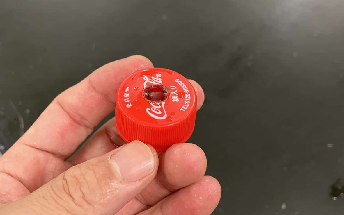 ① コーラのふたに、ハンダゴテやきりなどで小さな穴を開けます。 (※火や刃物を使うときは、必ず大人の人と一緒に行いましょう)