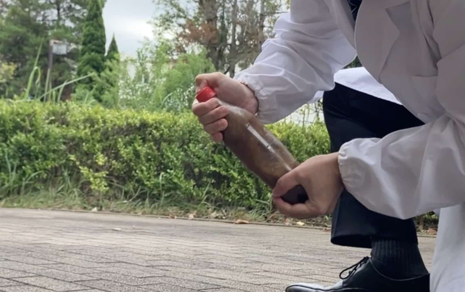 ① 実験手順③(振る) ペットボトルを振ると、コーラ(液体)に溶けていた二酸化炭素が刺激され、一気に液体から飛び出して「気体」に戻ろうとします。
