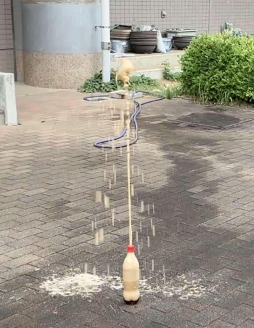 ④ ボトルを床や地面に置きます。 心の準備ができたら、押さえていた指を一気に離します!(または養生テープを一気に取ります)