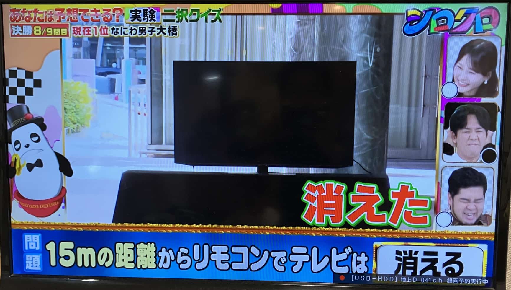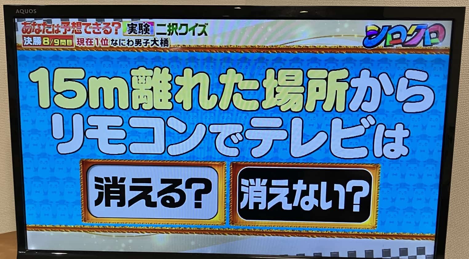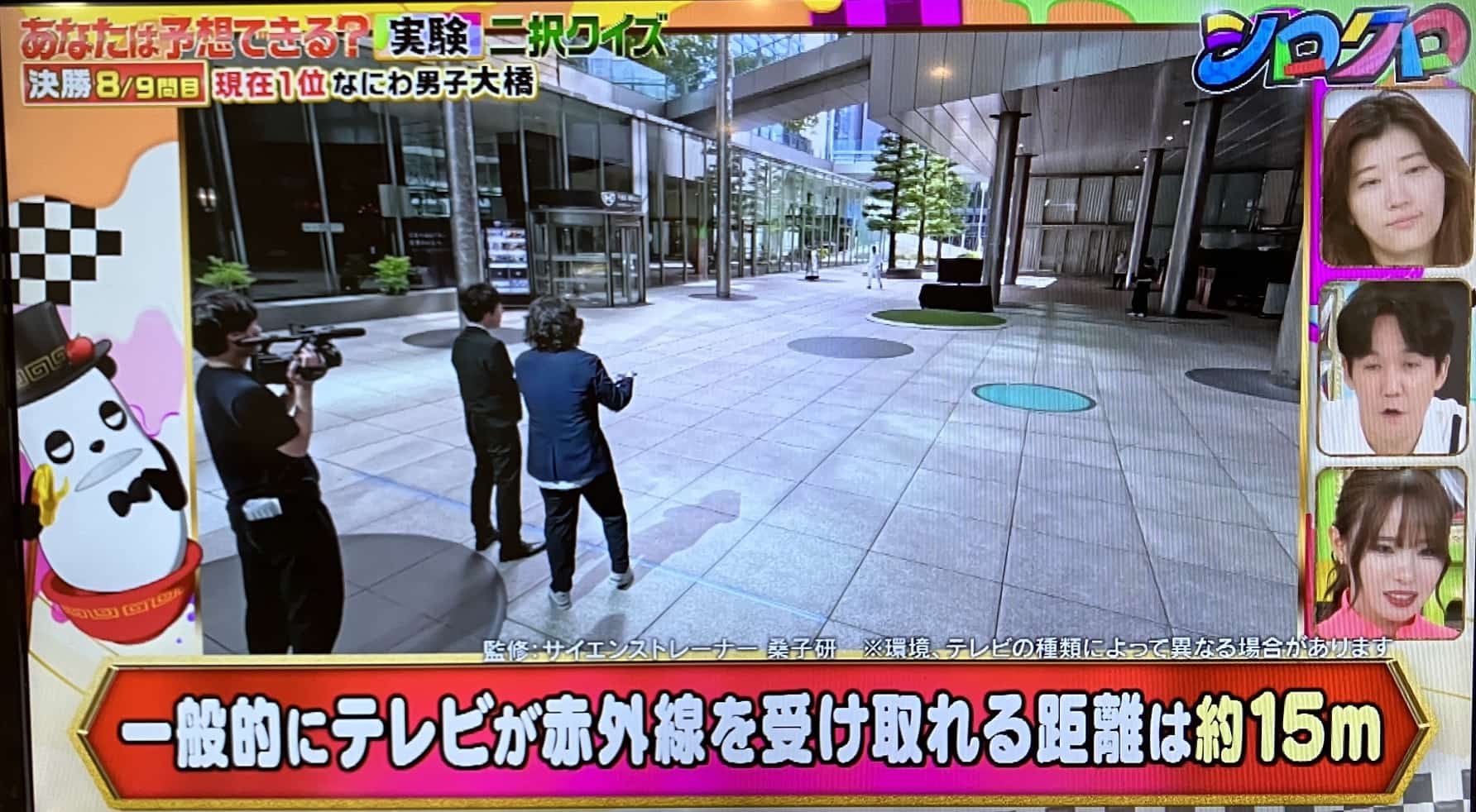 今回監修を担当したのは、「テレビのリモコンは15m離れていてもテレビをつける(消す)ことができるのか?」という二択クイズの部分です。テレビ番組のスタジオという広い空間で、実際に15m離れた場所から実演が行われました。
