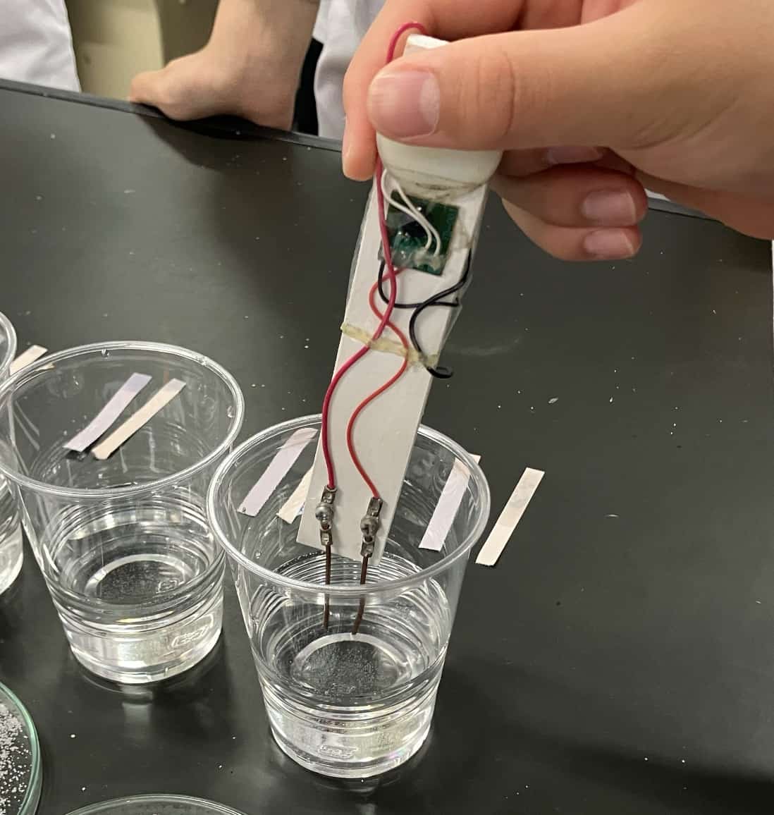 これはシビれる実験です! 水に溶かした液体に、電極を入れています。砂糖水は電気を通しません。砂糖は水に溶けても「分子」のままだからです。しかし、塩水を同じように調べると…電気が流れるのです! なぜなら、塩(塩化ナトリウム)は水に溶けると、ナトリウムイオンと塩化物イオンという電気を帯びた粒(イオン)に分かれる「電解質」だからです。見た目は同じ透明な液体でも、電気を流すかどうかで、その中身が全く違うことが暴かれてしまいました。