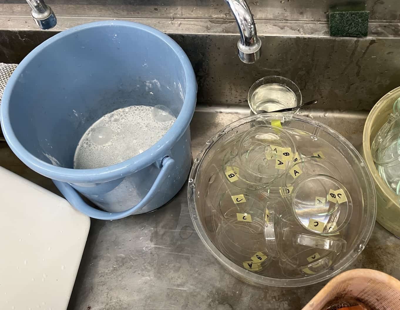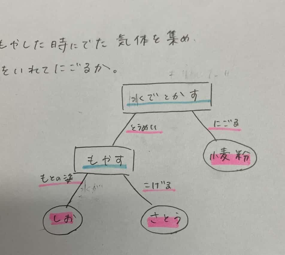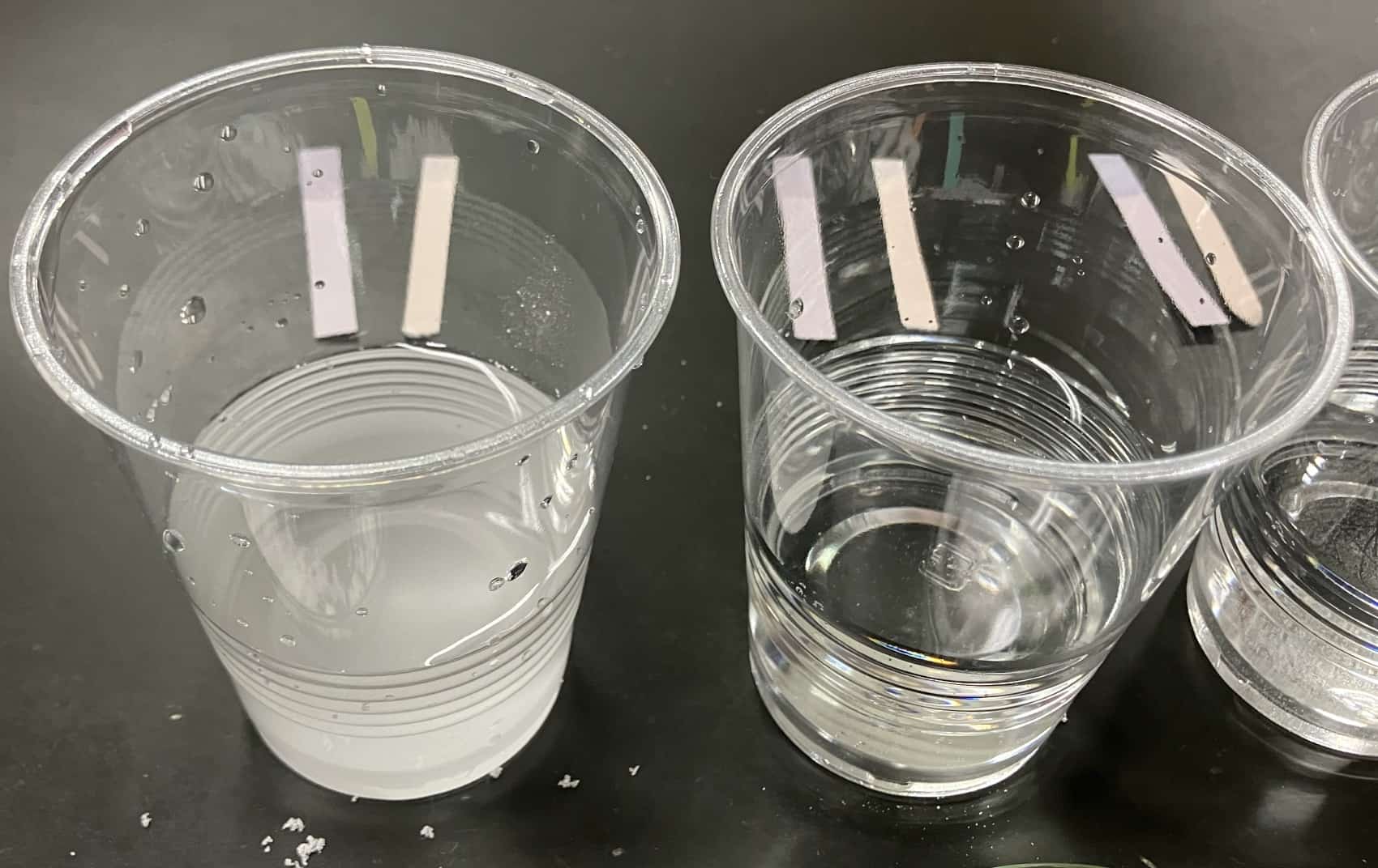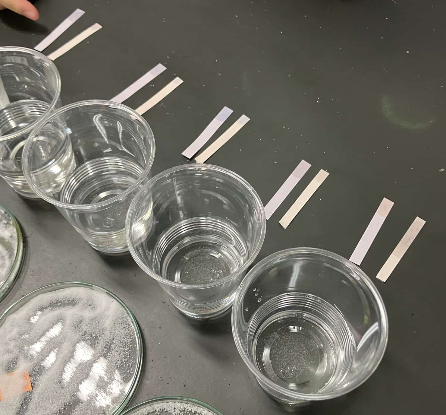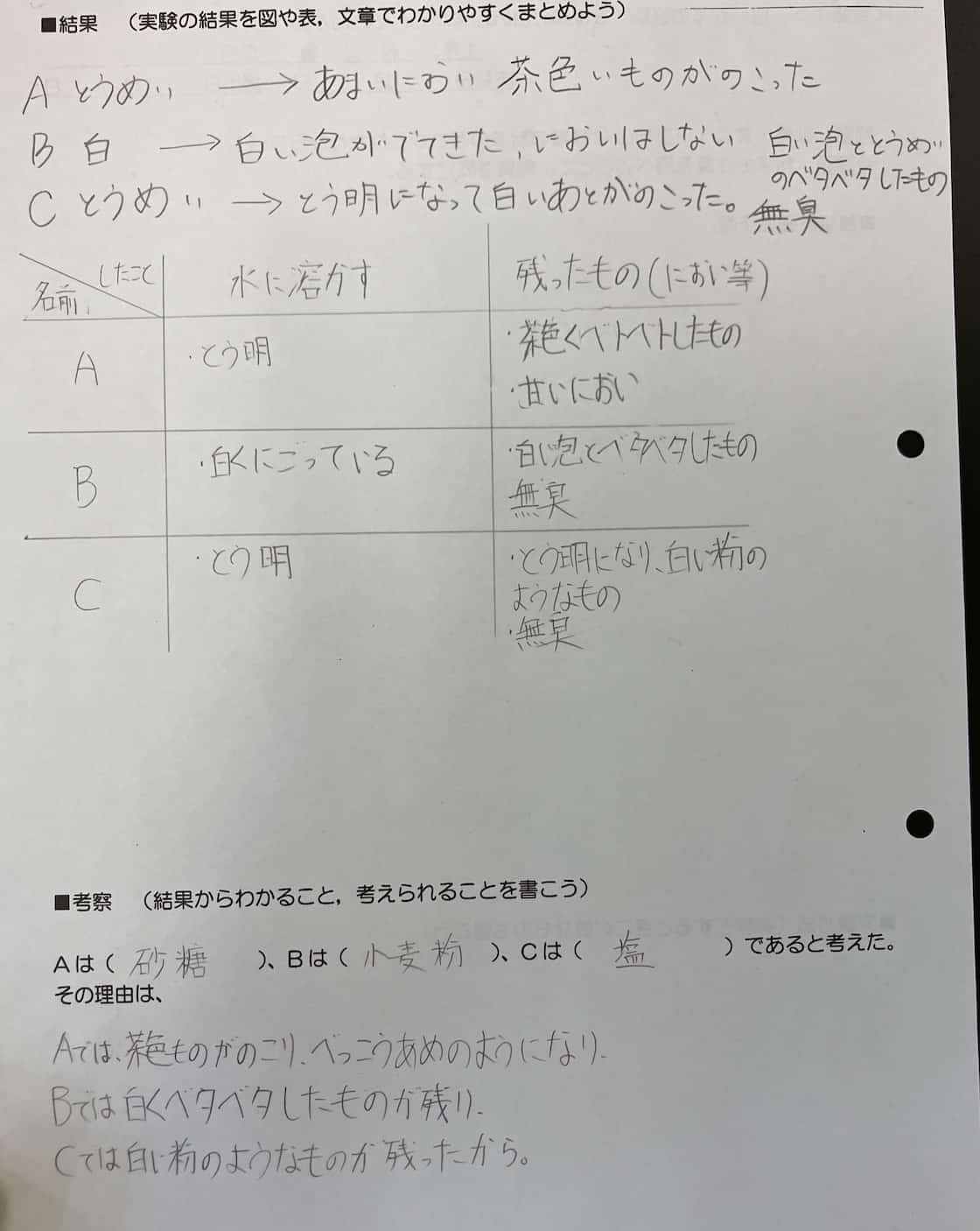 こちらの班は、液性(酸性・アルカリ性)を調べようとリトマス紙を使っています。今回は塩、砂糖、小麦粉なので、すべて中性で大きな変化はなかったはずです。しかし、もし「容疑者」に重曹(弱アルカリ性)やクエン酸(酸性)が加わっていたら…? このリトマス紙が、犯人を特定する決め手になったことでしょう。実験は、こうして難易度を調整できるのも面白いところです。