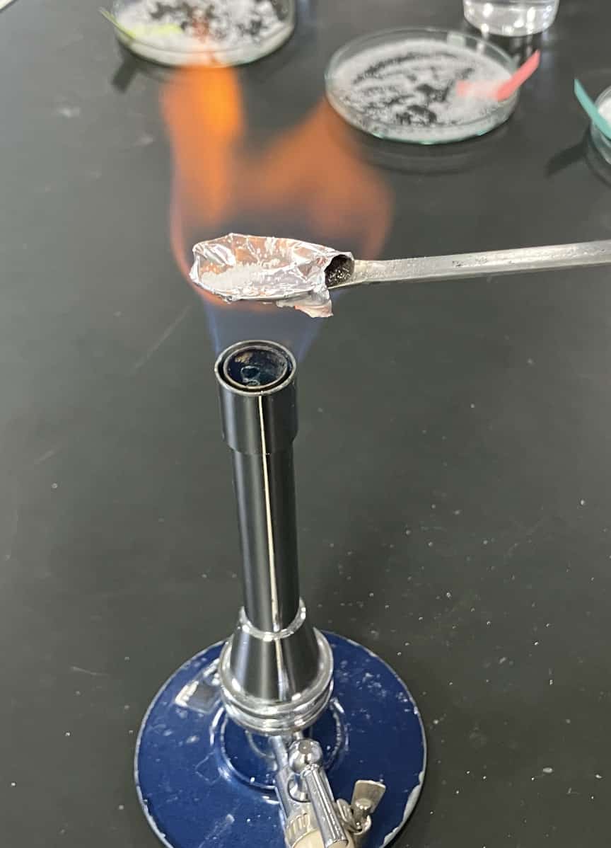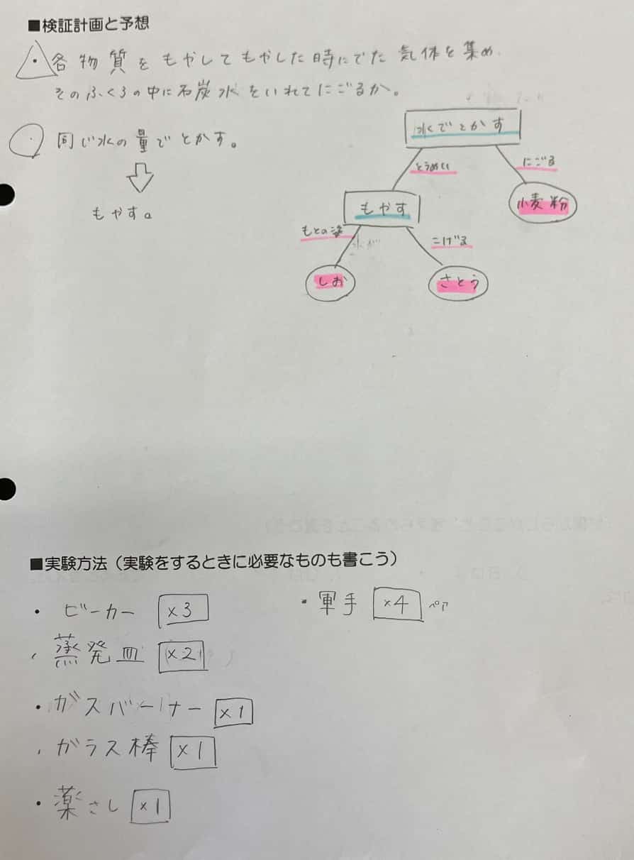 計画が決まれば、必要な「捜査道具」を書き出します。ビーカー、試験管、そして…ガスバーナー。いよいよ捜査開始です。