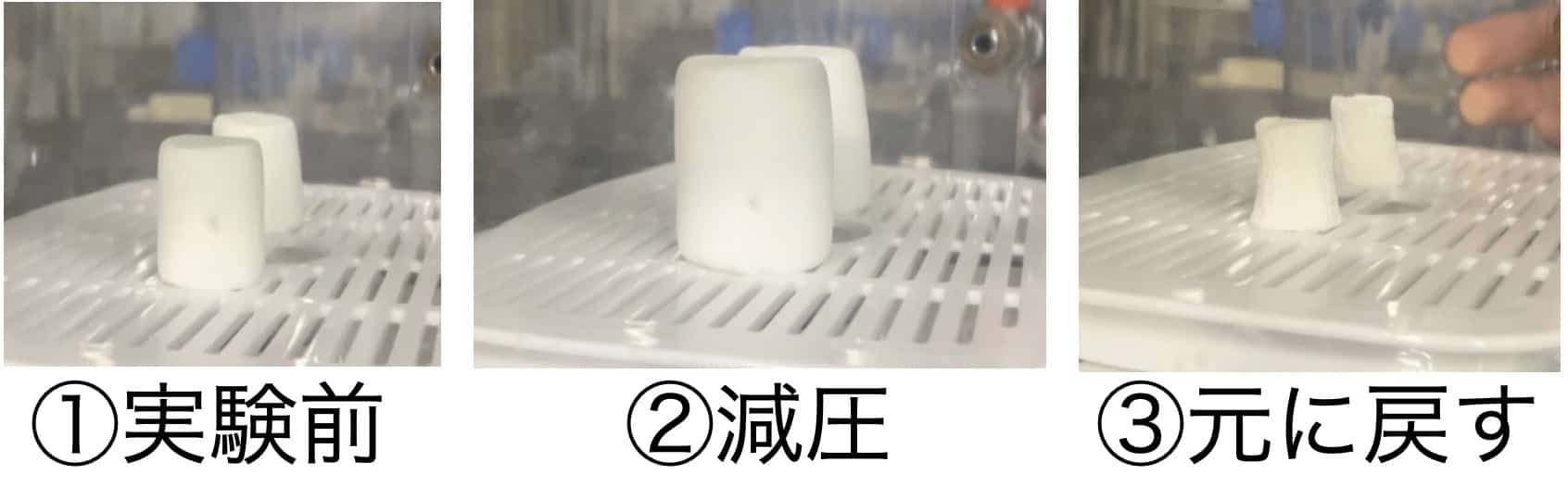 しかし、減圧装置で周りの空気を抜くと、マシュマロを外から押す力が弱くなります。 すると、中に閉じ込められていた空気の泡は「今だ!」とばかりに膨張し、マシュマロ全体を風船のように膨らませたのです。気体は、周りの圧力が低くなると体積が大きくなる性質があるのです。