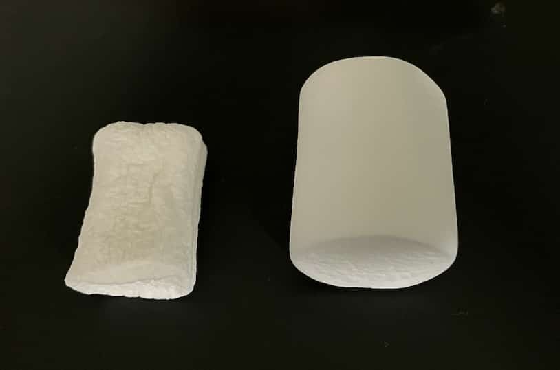一度膨らんだマシュマロは、パンパンに膨らみすぎた風船と同じ状態です。 マシュマロの構造、つまり空気の泡を支えていた壁(ゼラチンの骨組み)が、膨張の力によって伸びきったり、一部が壊れてしまったりしたのです。そこに一気に空気を戻す(元の気圧に戻す)と、今度は外側から強い力でギュッと押しつぶされます。 しかし、中の骨組みはすでに壊れかけています。体を支える骨が折れてしまったようなものですから、外からの力に耐えられません。