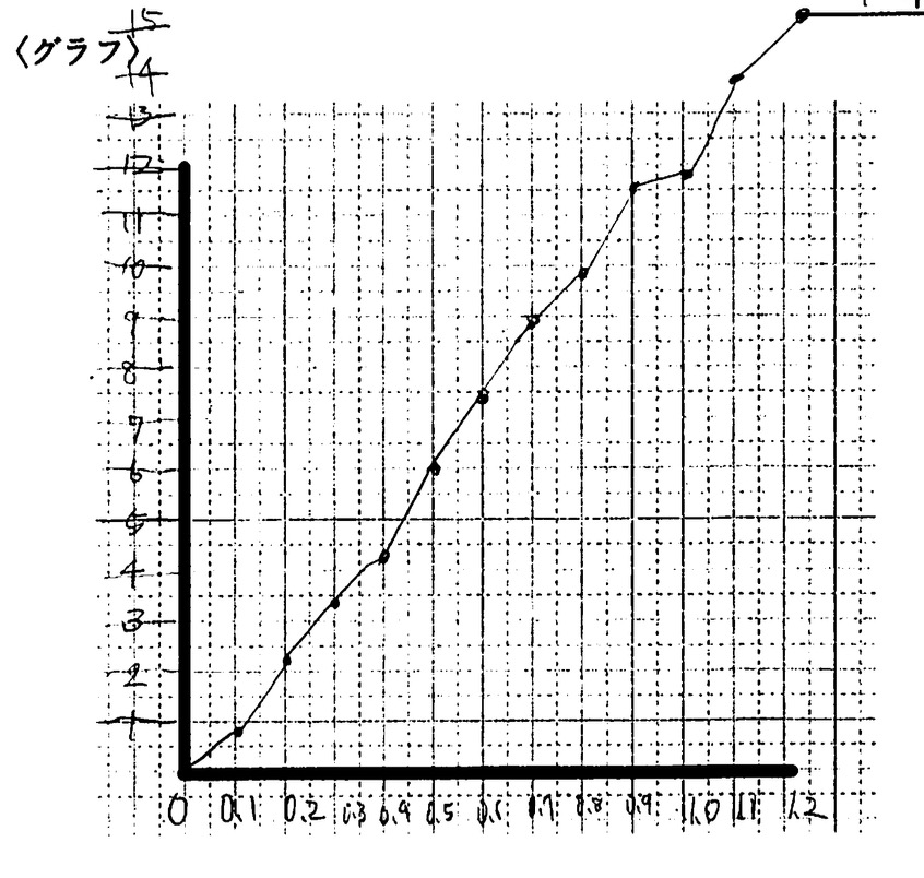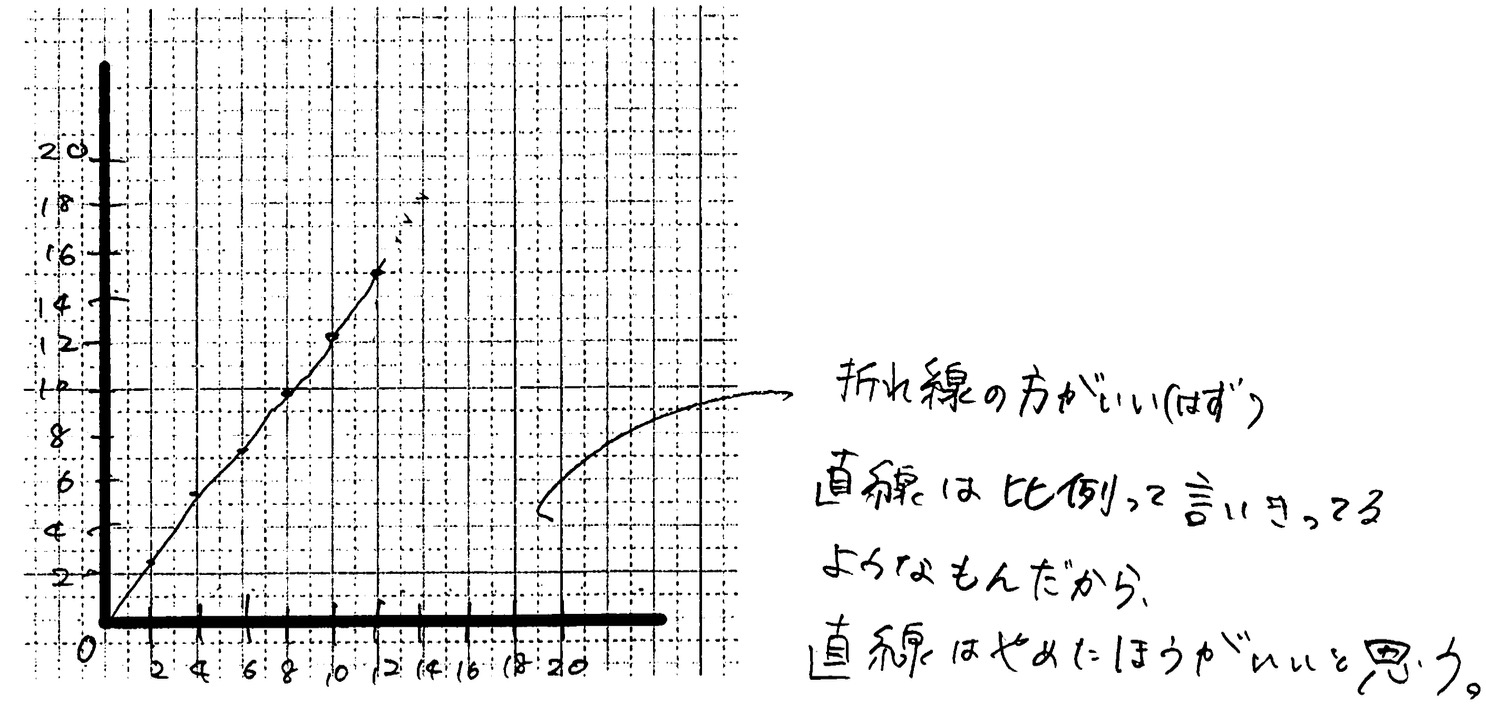 多くの班は、測定した点を定規で几帳面に結んで「折れ線グラフ」にしました。またある少数の班は、点と点の真ん中を通るような「直線」を引こうと試みました。教師が「こうしなさい」と言わなかったため、教室には「多様なグラフ」が生まれたのです。