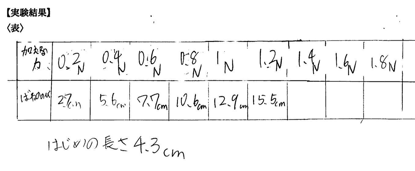 中学1年生にとって、フックの法則の実験は初めて行う「本格的な定量実験」になります。定量実験とは、数値を使って物の性質を調べる実験のことです。通常、学校の実験といえば「おもりは〇個使って、〇cmごとに記録しなさい」と、料理のレシピのように手順が決められていることが多いものです。でも、今回はあえてそれをしませんでした。「ばねののびと力の関係を知りたいけれど、どうやって調べたらいいと思う?」と問いかけ、実験計画そのものを生徒たちに委ねたのです。
