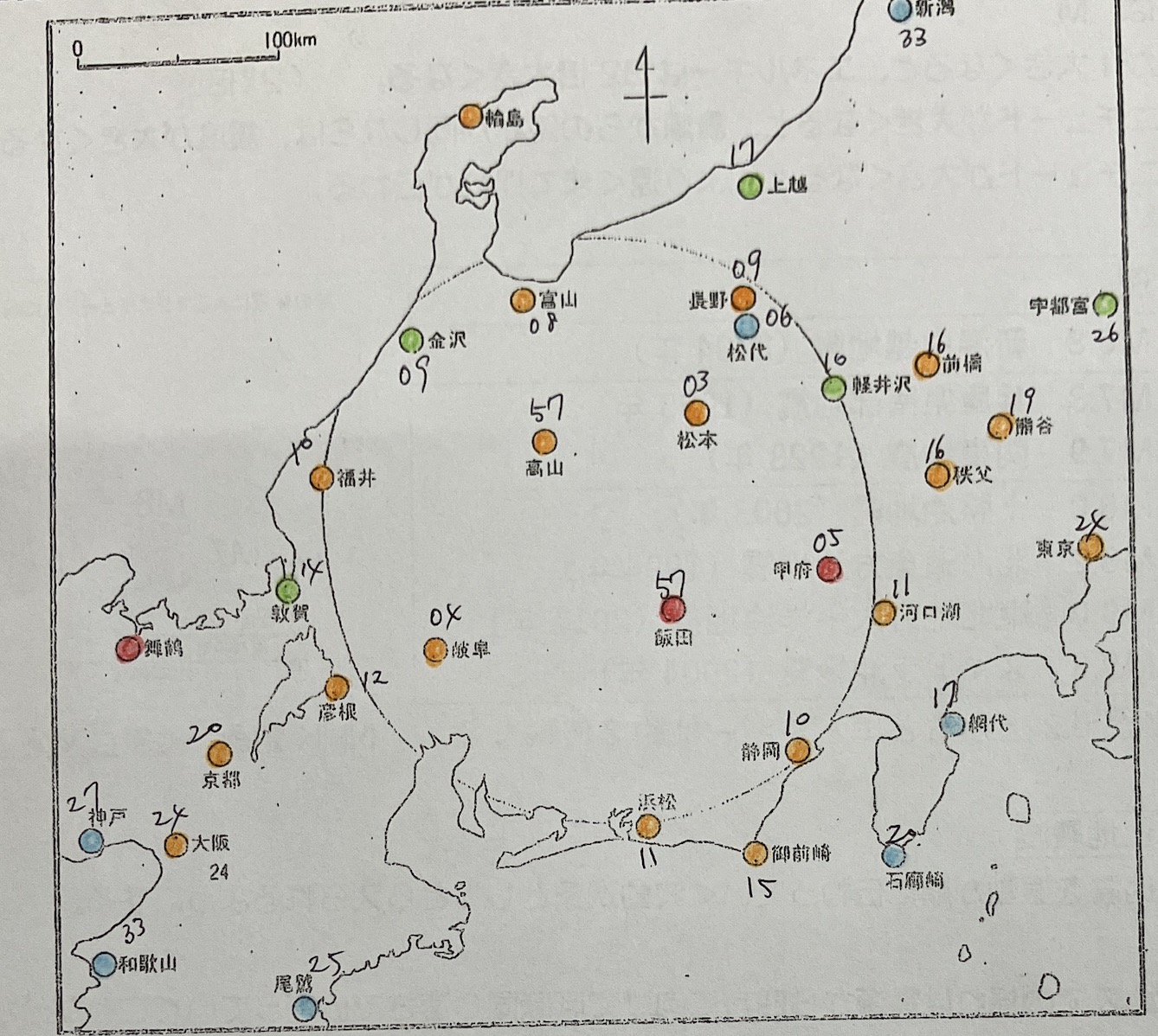 今回使用したのは、ある地震のデータと白地図です。 地点名の横にある丸の中に、揺れ始めた時刻(秒の部分のみ)と、震度を色分けして記入していくのが最初のミッションです。