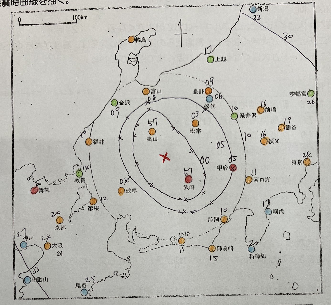 ここからが少し難易度の高い、けれど面白いステップです。 0秒・5秒・10秒・30秒といった区切りで、同時に揺れ始めた地点を結ぶ「等発震時曲線(とうはっしんじきょくせん)」を引いていきます。天気図で言うところの等圧線のようなものですね。