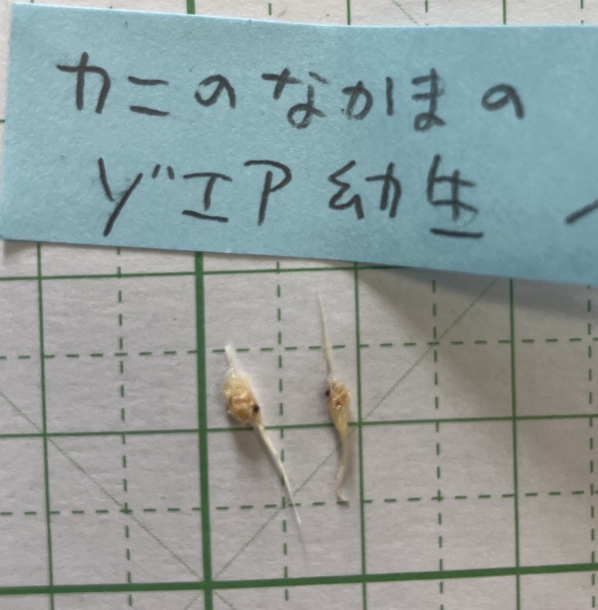 カニといえば横歩きをする甲羅のある姿を想像しますが、赤ちゃんの頃はプランクトンとして海中を漂うために、こんな形をしているのですね。ここから「メガロパ幼生」というヤドカリのような姿を経て、私達の知るカニの姿へと劇的な変態を遂げます。