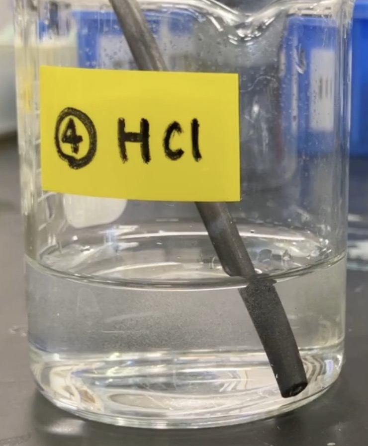 1.亜鉛板の場合 塩酸に入れた瞬間、「シュワシュワ」と勢いよく泡が出てきます。これは亜鉛が塩酸に溶けて、水素ガスが発生している証拠。「わっ、溶けてる!」と生徒たちの反応も上々です。