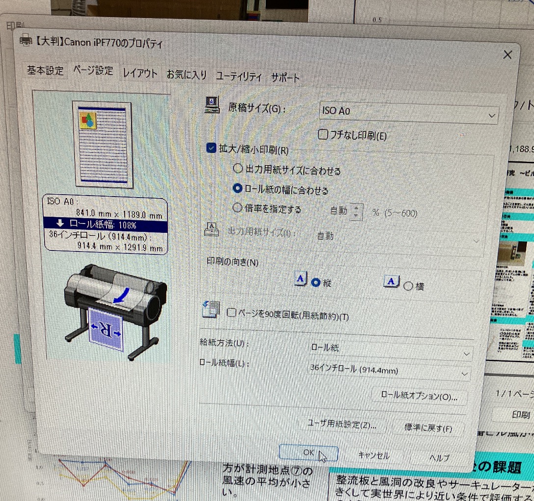 Canvaで作成したデータは、必ずしも最初からA0サイズで作成されているとは限りません。そんな時に役立つのが、プリンタードライバーの拡大・縮小設定です。
