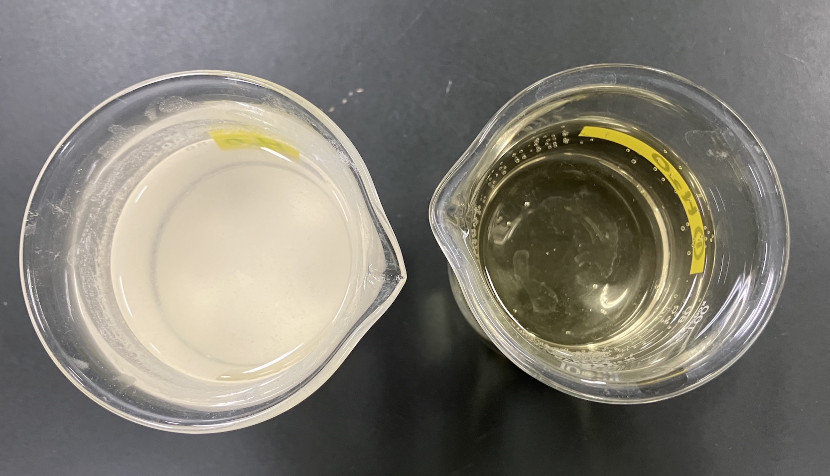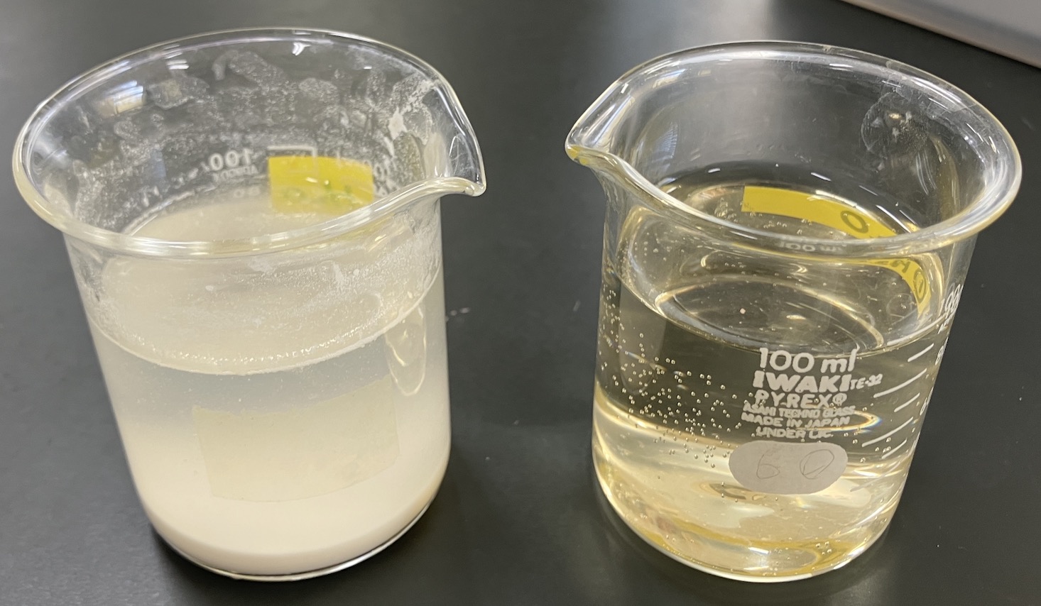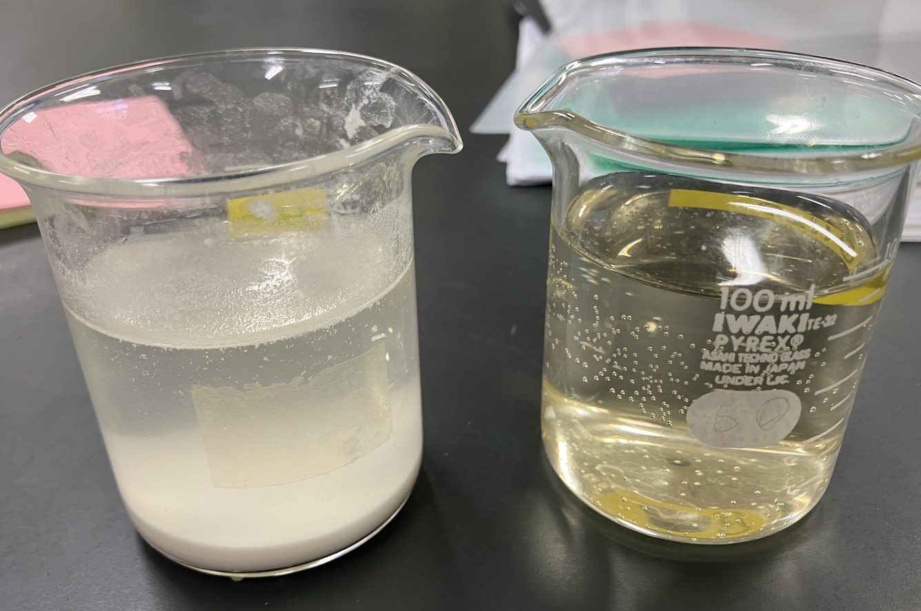 かき混ぜた後、2つのビーカーには決定的な違いが現れます。砂糖や食塩を入れた方は、しばらくすると液体が透明になります。これが理科の言葉で言う「溶ける(溶解)」という状態です。一方、デンプンや小麦粉を入れた方は、いくらかき混ぜても液体が白く濁ったままになり、時間が経つと底に粉が沈んでしまいます。