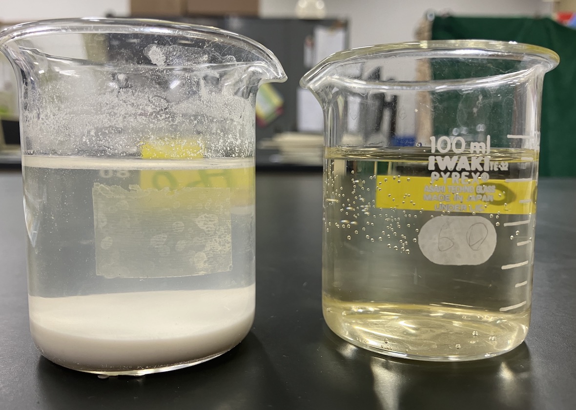- もう1つのビーカーには、デンプン(または小麦粉)を薬さじで1杯入れます。