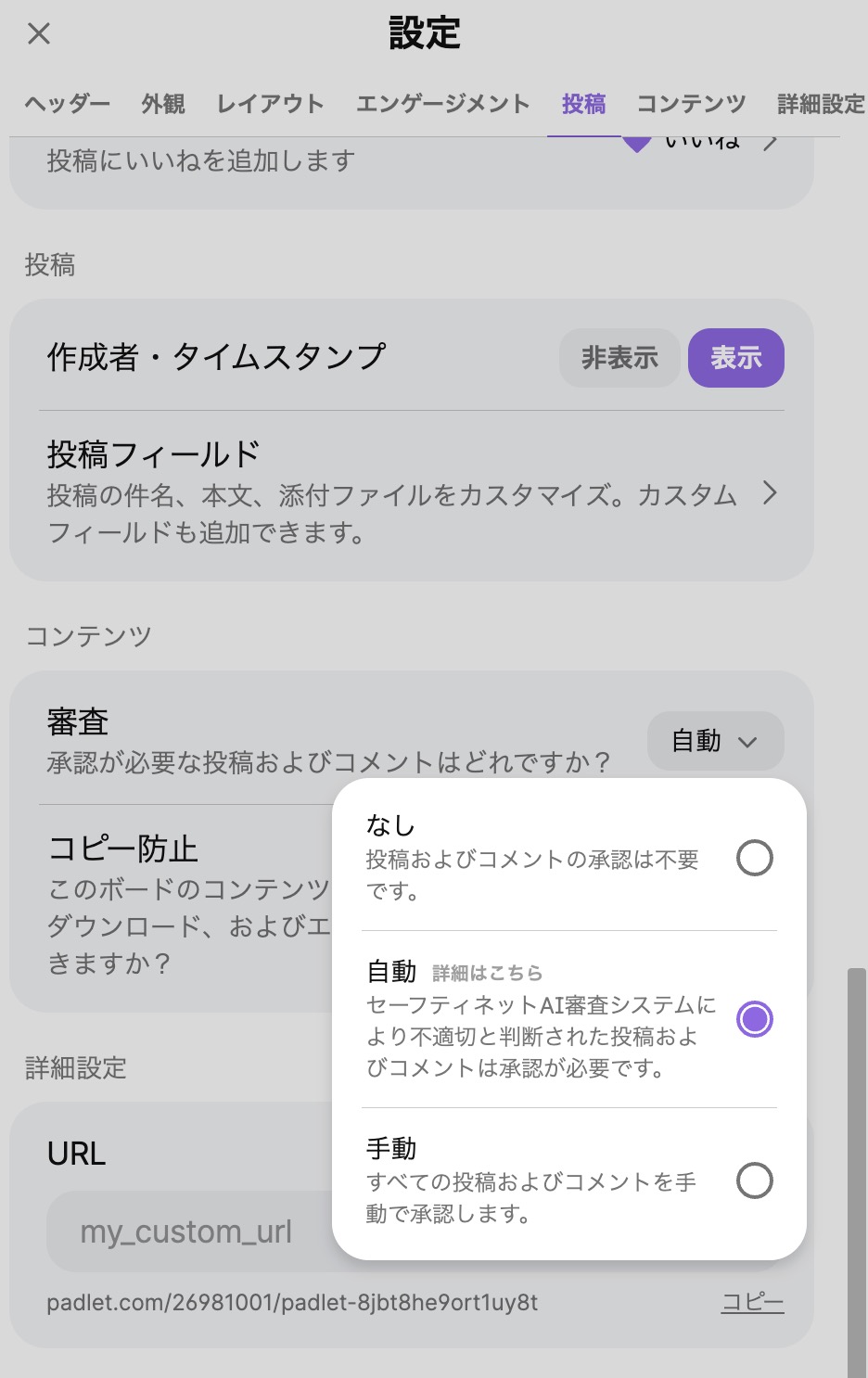 多くの人が集まる場だからこそ、プライバシー設定は重要です。設定メニューの中に「審査」という項目があります。ここで、投稿を即座に公開するか、管理者の承認を経てから公開するかを選択できます。