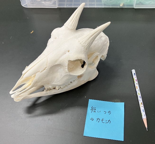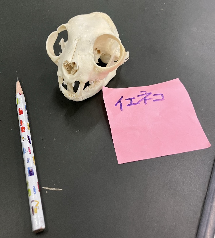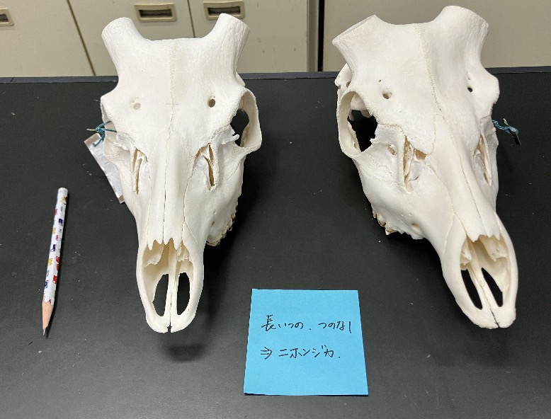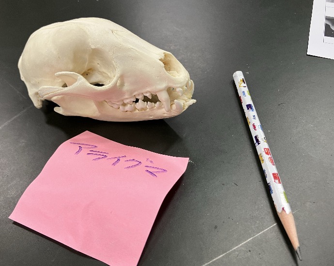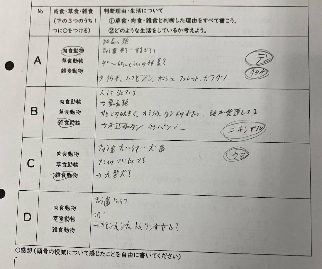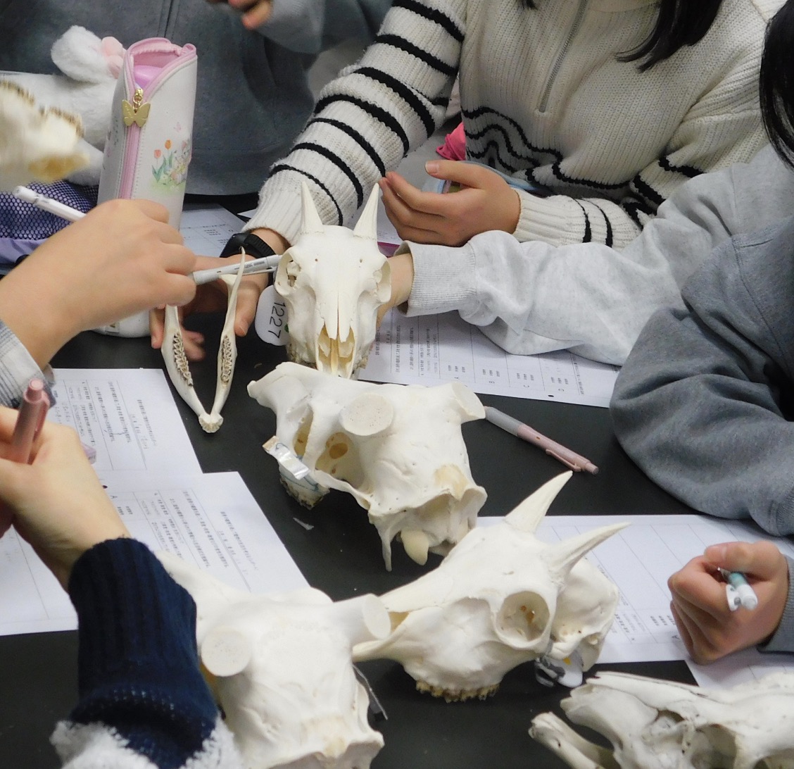 授業では、各班の机に配置された頭骨を観察し、その構造から「肉食・草食・雑食」のどれなのか、そして何という動物なのかを推理してもらいました。