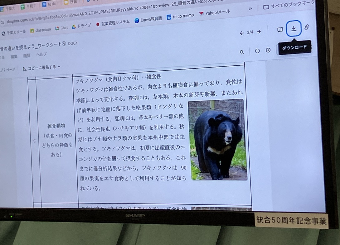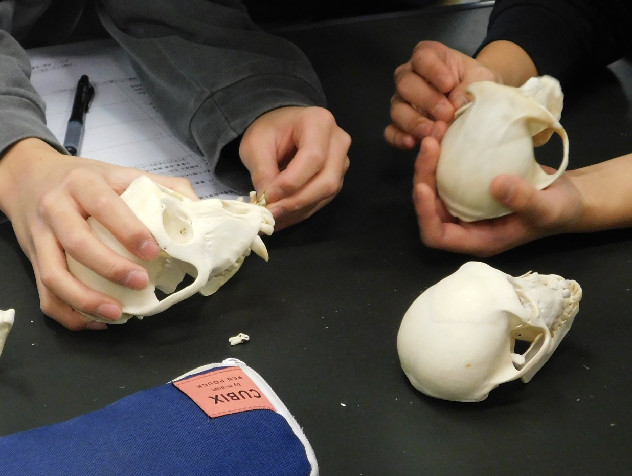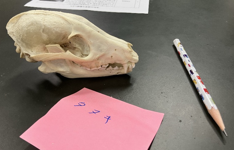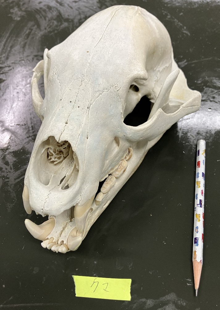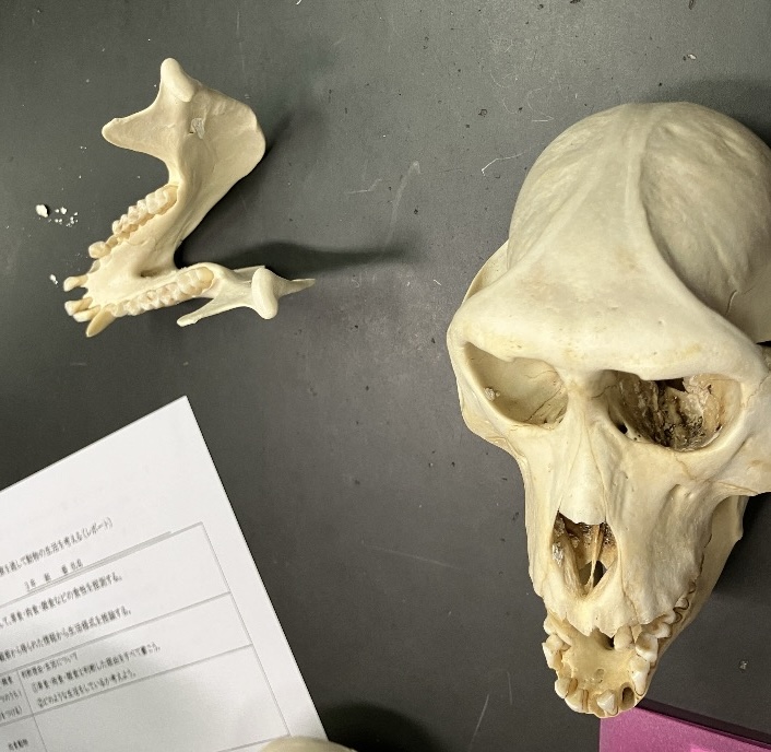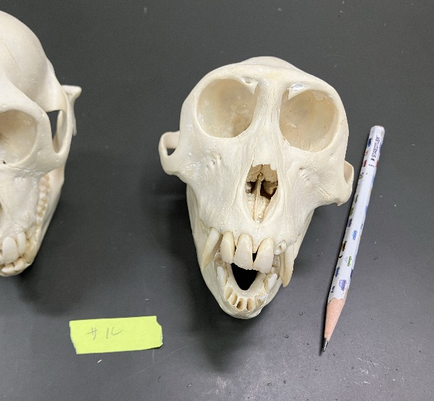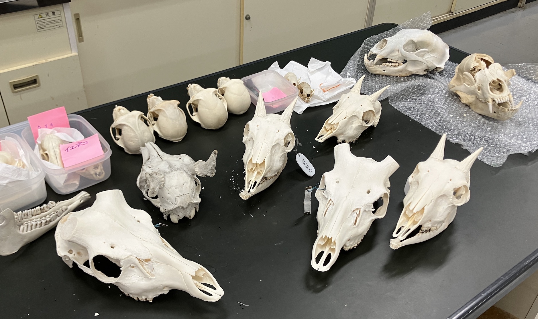 授業では、各班の机に配置された頭骨を観察し、その構造から「肉食・草食・雑食」のどれなのか、そして何という動物なのかを推理してもらいました。
