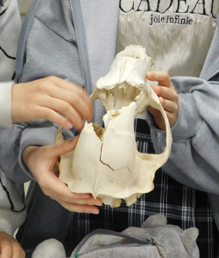 生徒たちは「この歯、すごく尖ってる!絶対にお肉を食べるやつだ」「こっちは目が横についているから、敵を早く見つけるためかな?」と、まるで名探偵のように骨の細部をチェックしていきます。「これ、トラじゃない?」「いや、日本にいる動物ならテンかも!」と、想像を膨らませて議論する姿は真剣そのものです。