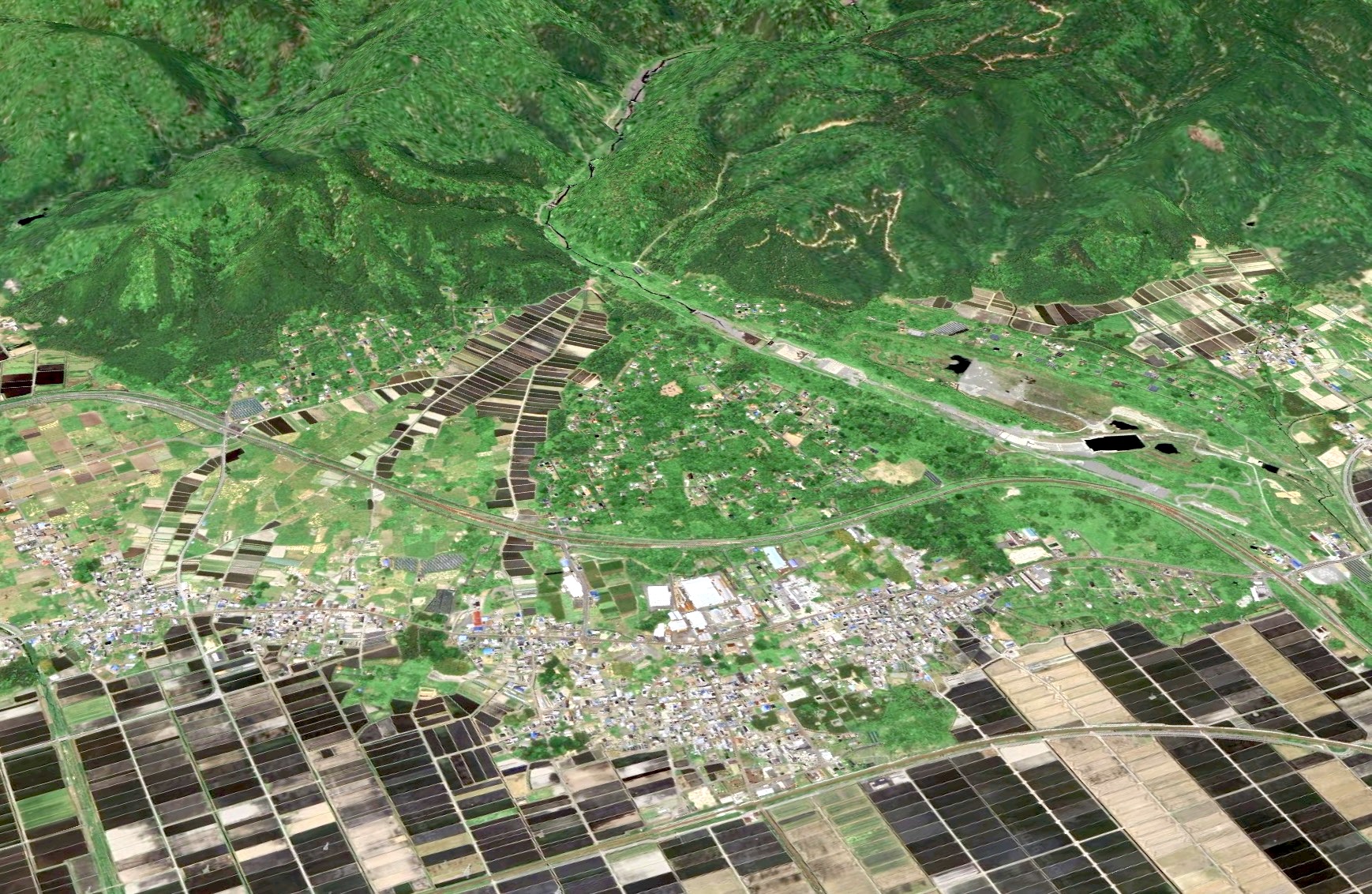こちらは滋賀県にある「百瀬川」の扇状地の様子です。GoogleEarthを使って観察しました。