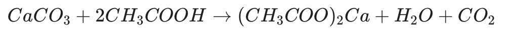 つまり、「水に溶けない固形物」が、反応した瞬間に「水に溶ける成分」と「ガス」に作り変えられてしまうのです。化学反応式で書くとこのように書けます(例えば酢酸を使った場合)。