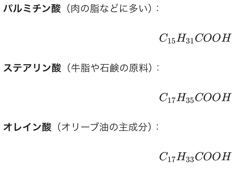 Rは「炭化水素基」と呼ばれ、「炭素と水素が長くつながった鎖の部分」を指します。このRの部分が、油の「ベタつき」や「水に溶けにくさ」を生み出す正体です。例えば、次のようなものが挙げられます。