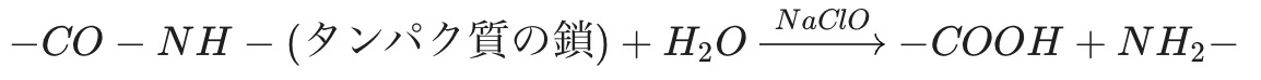 排水溝のヌメリや髪の毛などはタンパク質でできています。塩素の力は、この強固なタンパク質の鎖を酸化によって細かく切断し、水に溶ける状態まで分解してしまいます。タンパク質の骨格であるペプチド結合に、次亜塩素酸ナトリウムが反応すると、結合が不安定になり、最終的に以下のように切断されます。